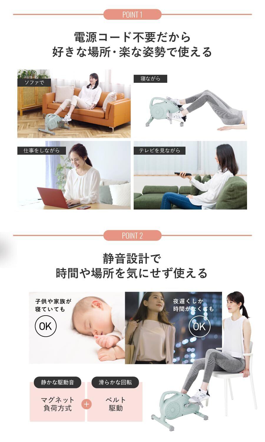 【電源不要、いつでもお好きな場所で】電源コードがいらず、どこでも使用可能です。コンパクトなので、デスクの下に置いて仕事や作業をしながらなど、時間がない方も効率よく有酸素運動できます。