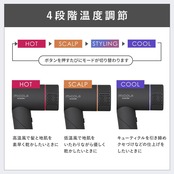 【風量2段階設定】風量がTURBO/SETの2段階の調節が可能。TURBOでは風量を強く、SETでは風量を弱く設定できます。【4段階温度調節】HOT/SCALP/STYLING/COOL/の4段階の温度調節。高温風で髪と地肌を素早く乾かしたいときはHOT、低音風で地肌をいたわりながら優しく乾かしたいときはSCALP、キューティクルを引き締めくせづけなどの仕上げをしたいときにはCOOLの使用がおすすめです。温風と冷風が自動で交互に切り替わるSTYLINGモードは、温風で髪を温めてうねりやクセをとり、冷風で冷やすことでスタイリングをしっかりキープします。髪の目的に合わせてモードをボタン1つで切り替えて使うことができます。