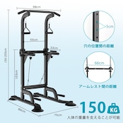 製品サイズ:懸垂マシンの本体重量は約13kgで、ぶら下がりの本体寸法は幅約98cm、奥行き約80cm、高さ約150~205cm(チンニングスタンドの高さは10段階調節可能)です。最大耐荷重は150kgです。