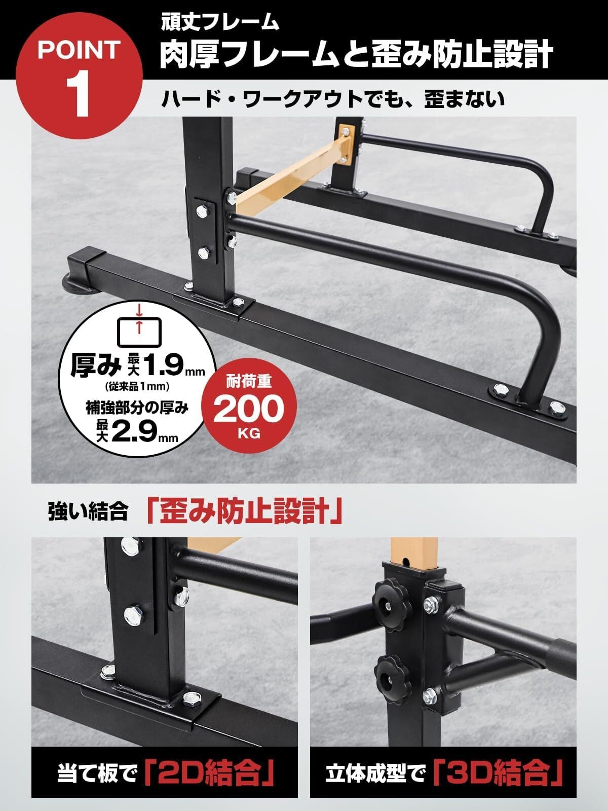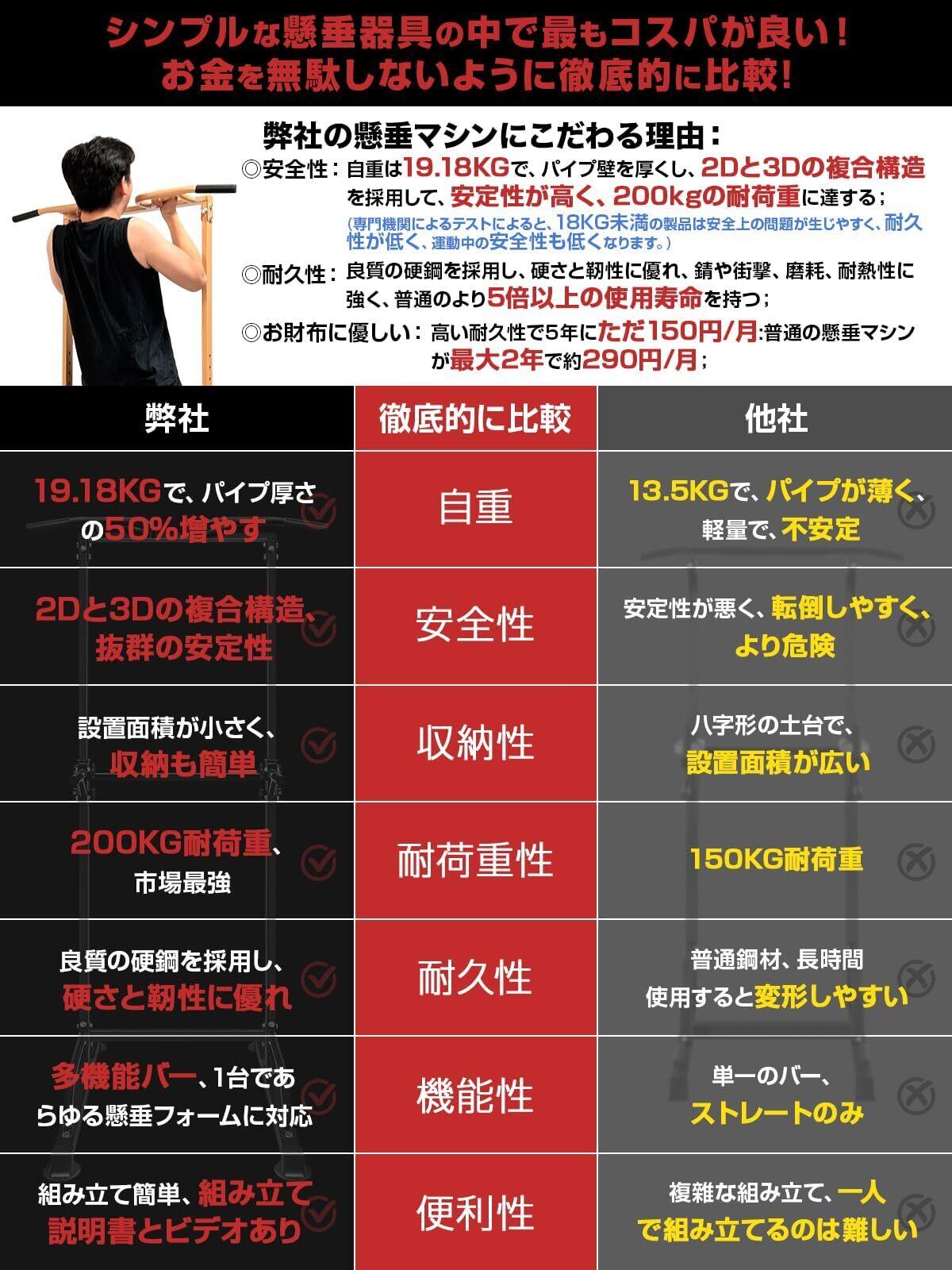 【安定性が抜群な設計・圧倒的耐荷重200KG】安定性を追求し、厚手の冷間圧延鋼管を採用して、全体の自重は42.3ポンドに達した懸垂マシン・ぶら下がり健康器です。独特な三角力学支持構造、【当て板の2D結合】と【立体成型の3D結合】を組み合わせて、440ポンドの耐荷重、特に身長190 cm/体重200KG以内のユーザーのために設計を最適化の懸垂マシンです。また、大型衝撃吸収ヘッドをさらに大きく強化したことで、懸垂やぶら下がりの際の安定性と安心感が革新的に進化した次世代モデルです。