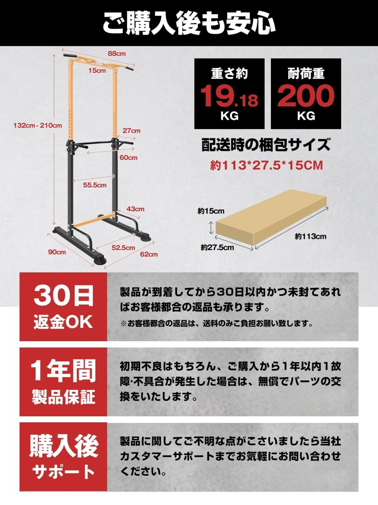 【様々な筋トレ】懸垂(チンニング)、プッシュアップ、ディップス。背筋、上腕三頭筋、腹筋、胸筋、腕筋、ヒップ、ウエスト。様々な運動ができて、いろいろな効果があります。筋力を鍛えたい方、汗を出してストレスを解消したい方、カラダを強く健康にしたい方、自宅で運動したい方にオススメです。【安心のアフターサービス】お客様へ「確実な満足」を提供できるよう、1年間の破損交換を付属しています。不良などがありましたらメールにて連絡いただければすぐ処理できます。どうぞお気軽にお問い合わせください。