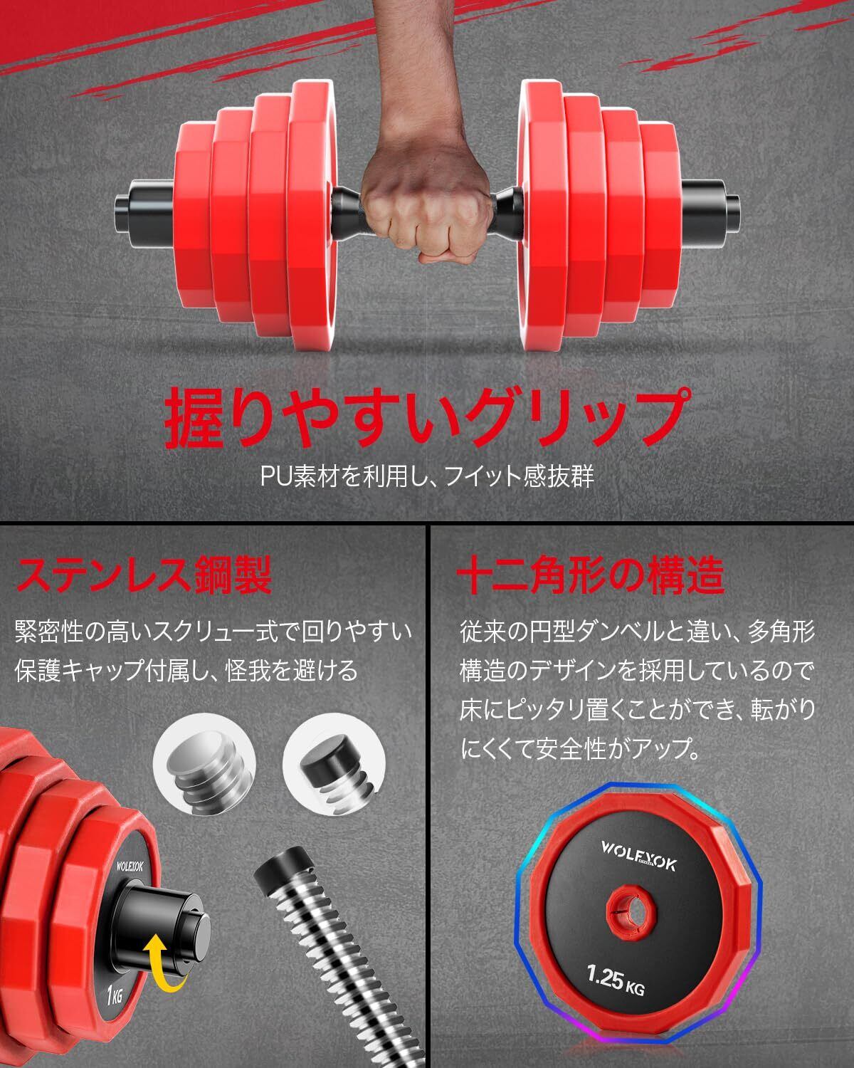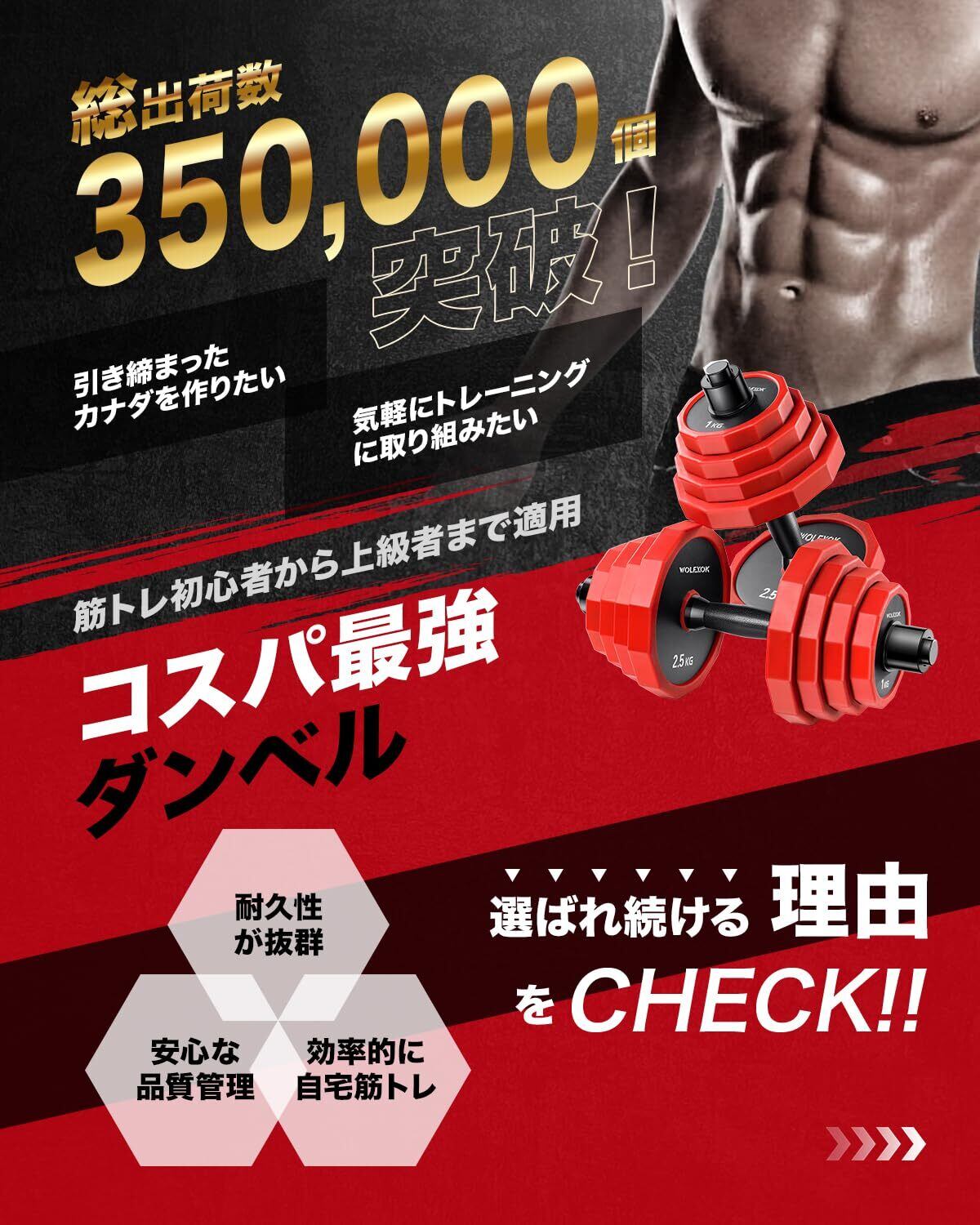 【高コスパなスチール製ダンベル】当社のスチール製ダンベルセットは、無駄な流通を省き、工場との直取引で圧倒的なコストパフォーマンスを実現しました。品質を犠牲にせず、質感と耐久性がどこにも負けない、初心者から上級者まで使いやすい可変式ダンベルを提供します。ダンベルの製造は、世界各国の有名スポーツブランドが使用する生産工場で行っています。 【安心と充実のサポート】特製の日本語トレーニングマニュアルをはじめ、FAQや丁寧なサポート体制を完備します。ご質問があれば、日本語対応のスタッフが迅速に対応いたします。コミュニケーションに不便を感じることはなく、安心してご利用いただけます。