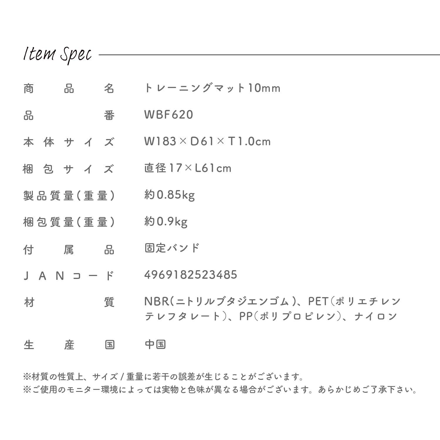【商品仕様】本体サイズ:幅183×奥行61×高さ1cm/重量:約850g/材質:NBR、PE、PP、ナイロン/付属品:固定バンド/カラー:ブラック