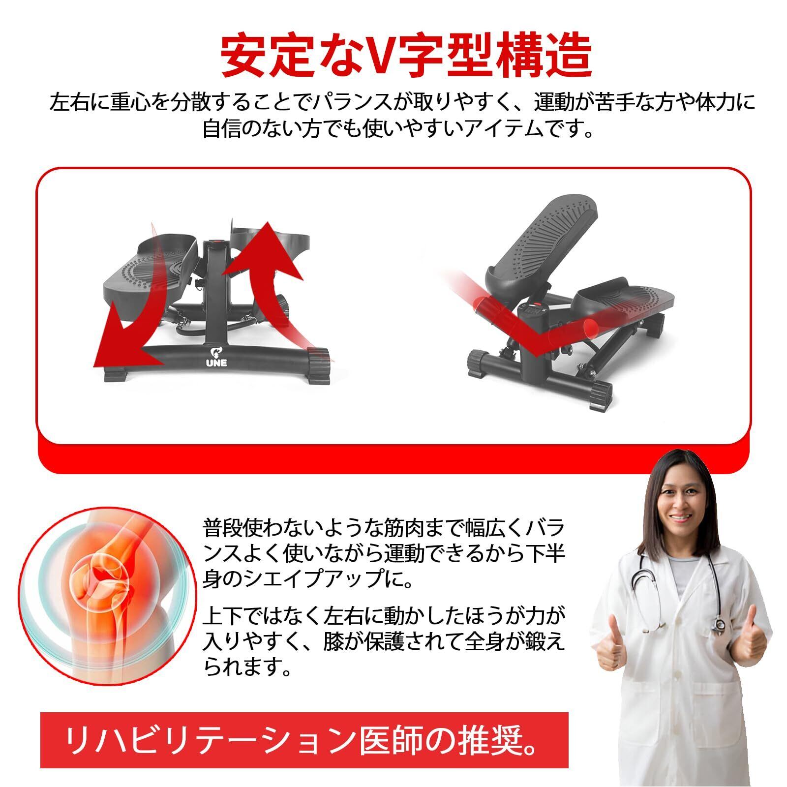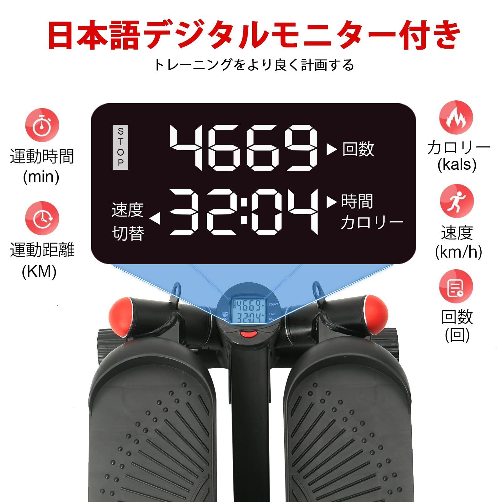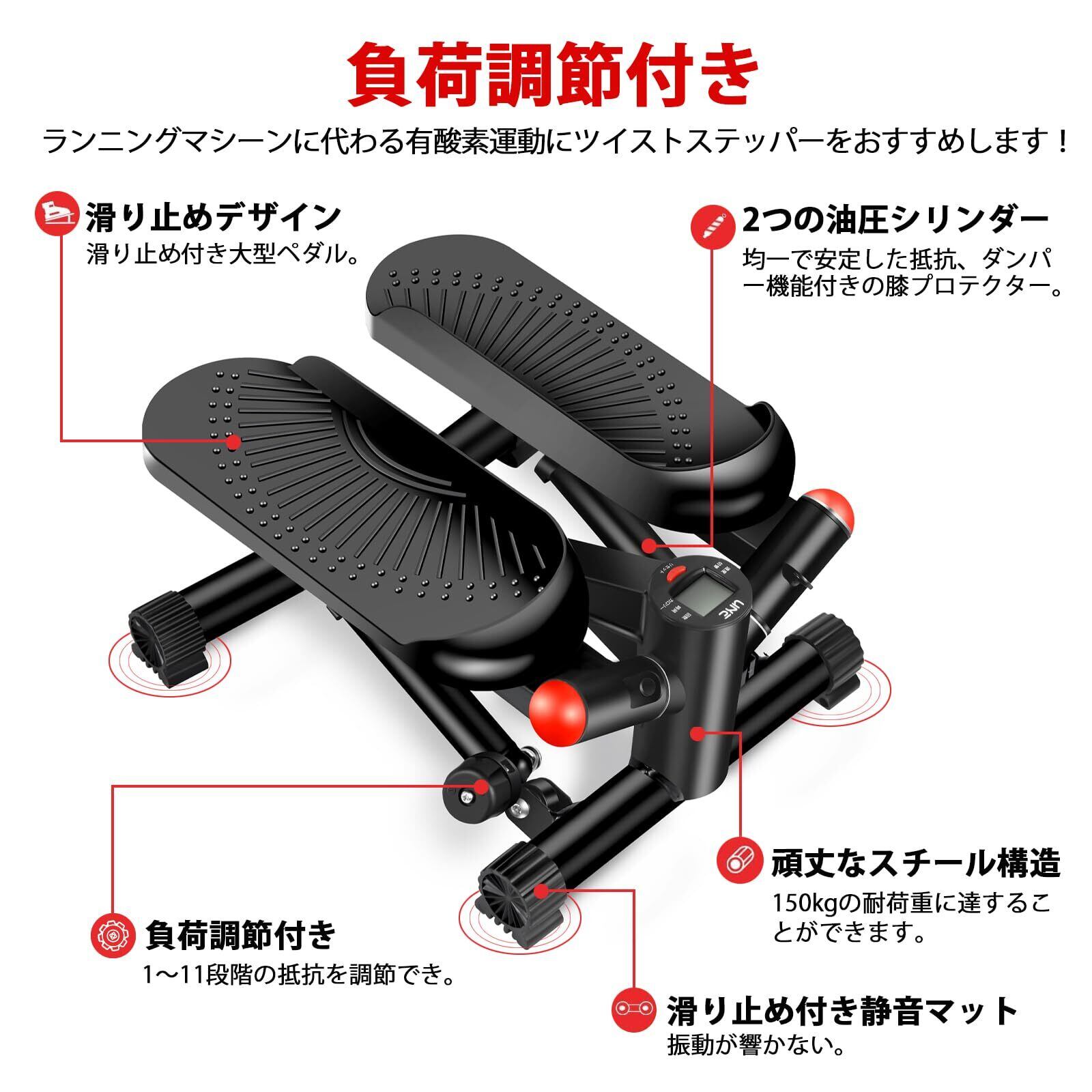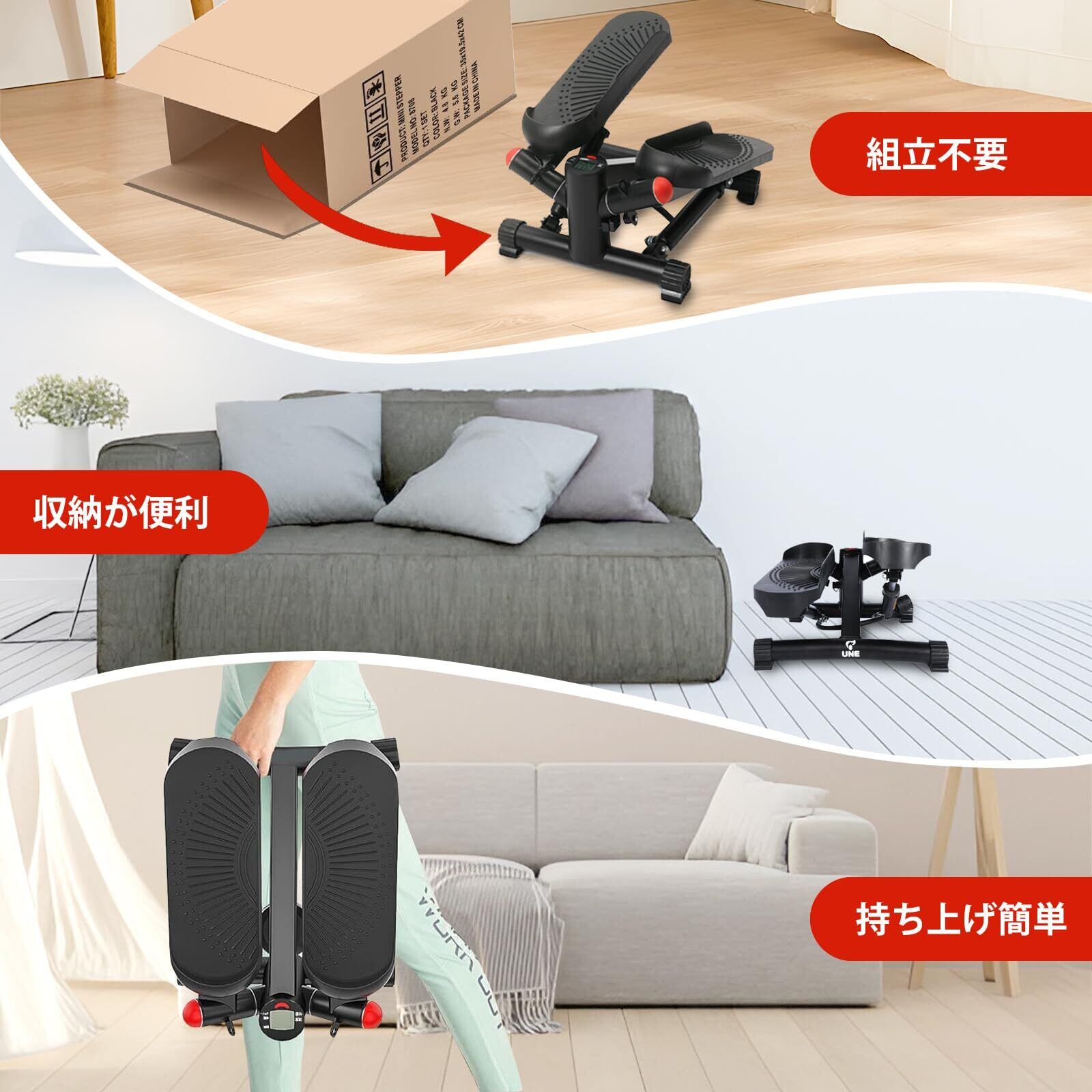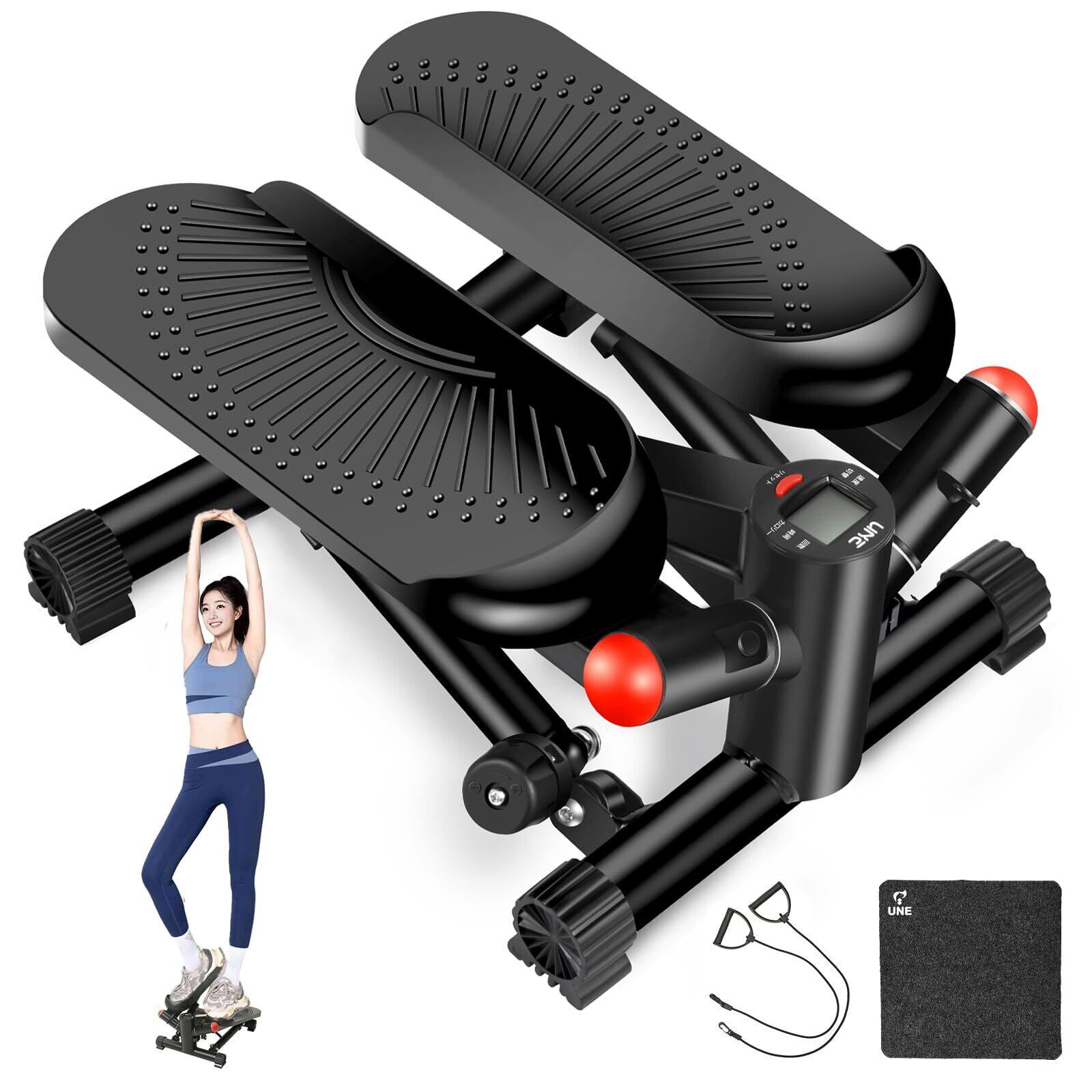 UNE ステッパー 健康器具 負荷調節付き バンド/保護マット付き LCDモニター搭載 静音ステッパー 人間工学設計 ㇵ字型 筋トレ 有酸素運動 エクササイズ 足踏み健康器具 コンパクト 収納が簡単 高齢者足を鍛える器具 ブラック