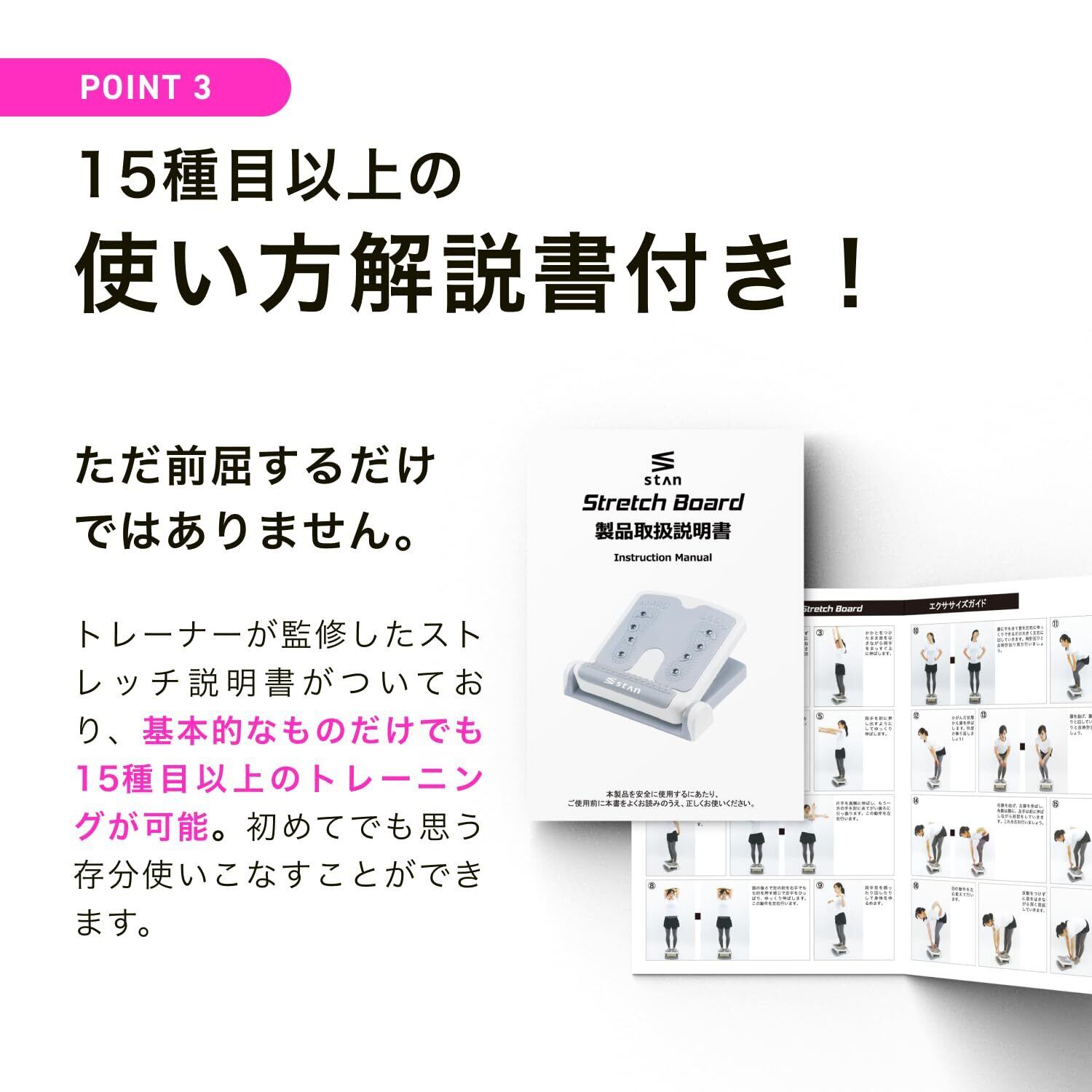 【 豊富なストレッチバリエーション 】ストレッチボードの上で前屈したり、屈伸したりすることで様々な部位のストレッチをすることができます。本商品にはパーソナルトレーナーが監修した15種目以上のストレッチ方法の記載がありますので、初心者の方でも使用方法やストレッチ方法に困ることなく安心してご使用いただけます。