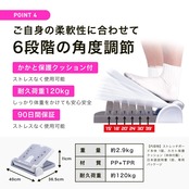 【 個々の柔軟性に合わせられる角度設定 】本商品は6段階で角度調整が可能なため個々の柔軟性に合わせてストレッチしていくことができます。また、その日のコンディションによって角度を変えるのも有効な方法です。初めは低い位置からスタートして、徐々に角度をあげてストレッチすることで効率のいいストレッチをすることができます。 【 足裏からのほぐし効果 】両足合計8個のマグネットストーンが足裏から筋肉をほぐす効果を助けます。ストレッチとマグネットストーン双方の効果で、さらに柔軟性を高める効果が期待できます。
