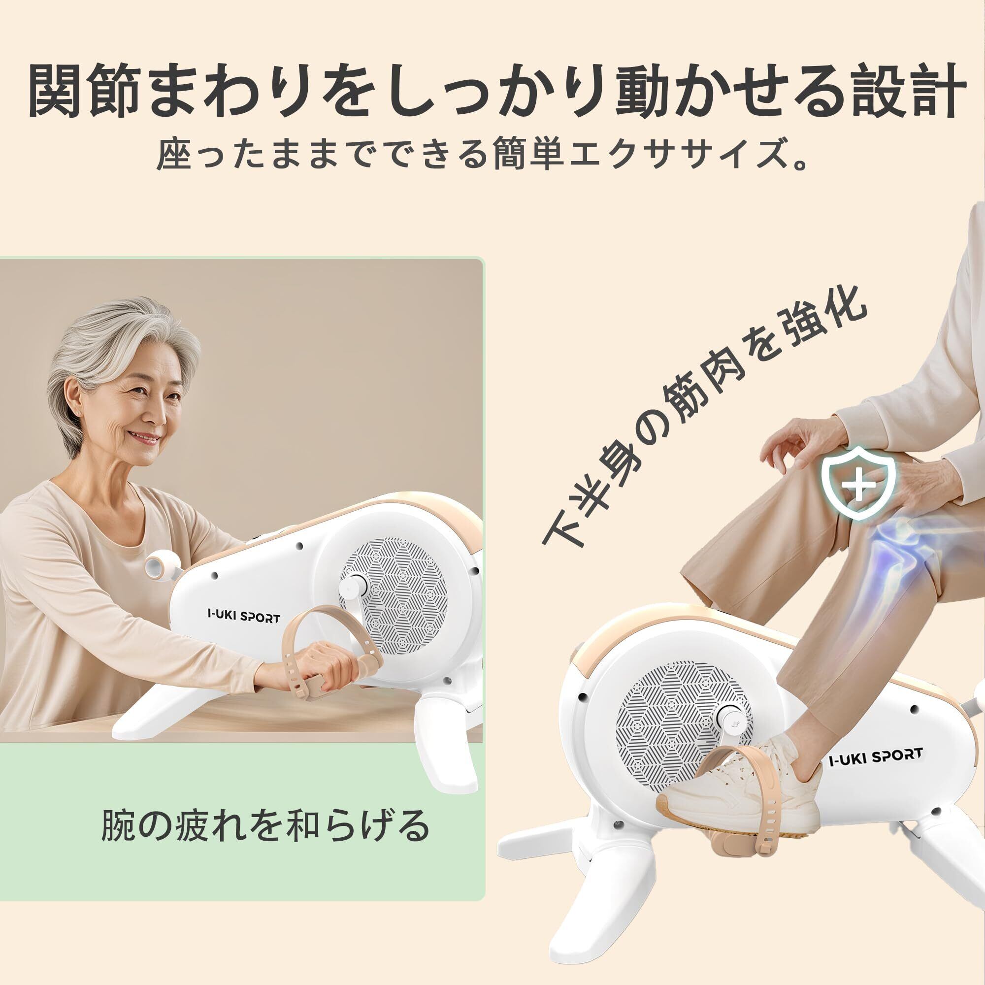 【自宅で気軽に運動習慣を】 家庭やオフィスで手軽に使えるミニエアロバイク。コンパクトな設計で、デスク下やリビングでも気軽に有酸素運動を取り入れられます。双方向のペダル構造で、下半身を中心に腕まわりも同時に動かせるため、効率的な全身運動が可能です。シニアの方にもやさしく、無理のない運動習慣づくりにおすすめです。