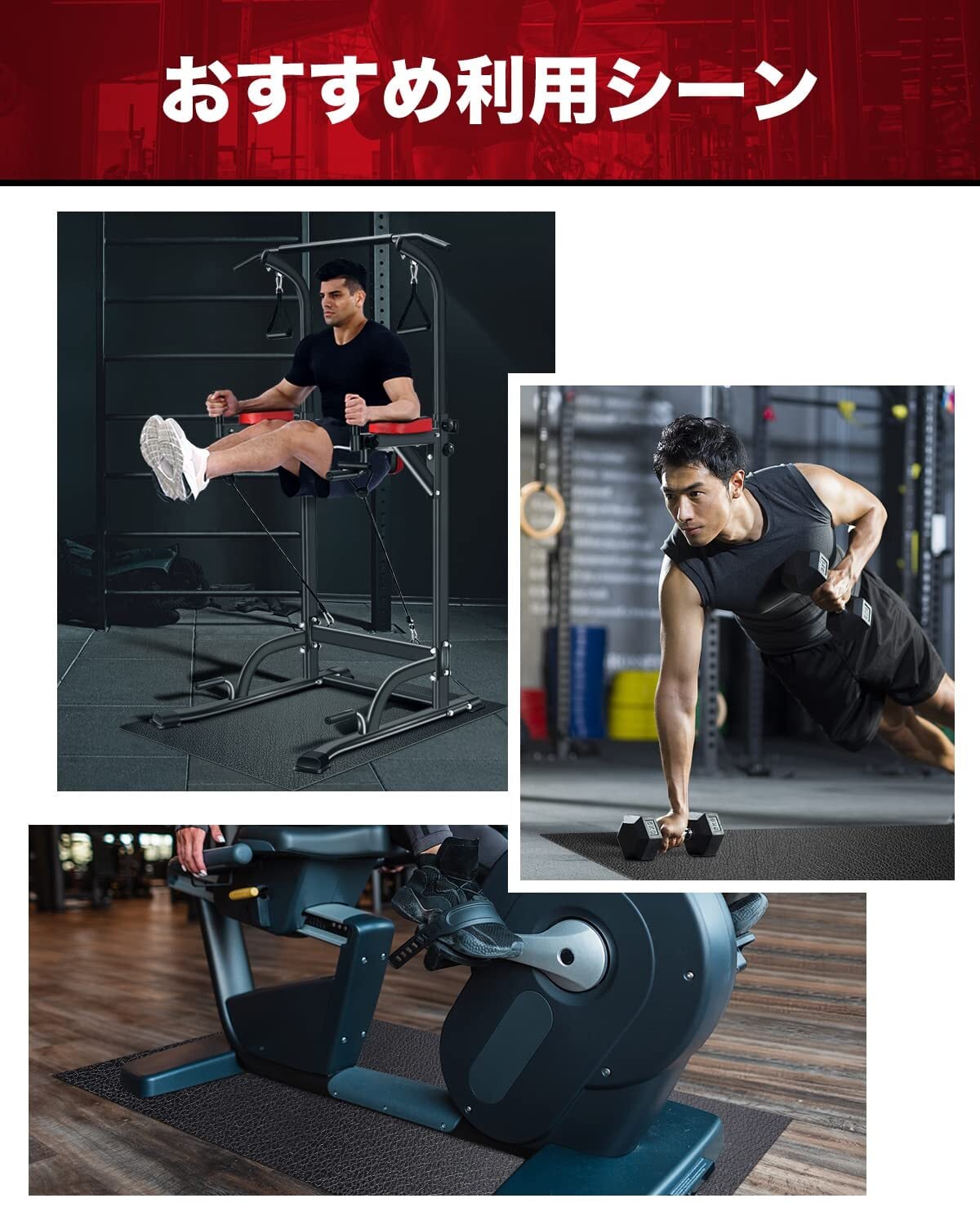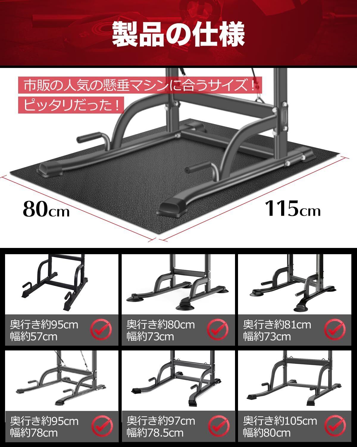 【多用途エクササイズ用マット】当社のトレーニングマットと懸垂マシンはセットとして開発されています。市販のほかのブランドのぶら下がり健康器にも適して、ダンベル、腹筋ローラー、エアロバイク、フィットネスバイク、ステップ台、ランニングマシン(ルームランナー)、腹筋ベンチなど様々な器具も完璧に適用されております。 ご注意:一部大型運動器具を本マットをご利用する場合、マットと合わない場合がございますので、各製品のサイズを事前にご確認ください。