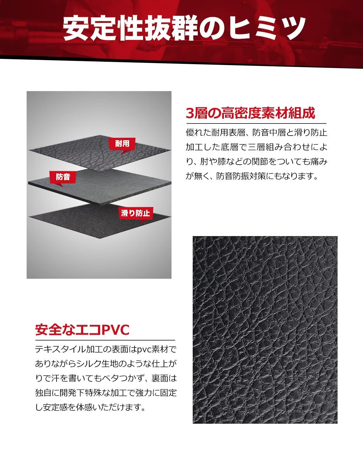 【3層の高密度PVC組成・床保護可能】優れた耐用表層、防音中層と滑り防止加工した底層で三層高密度PVC組み合わせにより、肘や膝などの関節をついても痛みが無く、防音防振対策にもなります。重たい機器でのトレーニングでも、耐引裂性、耐衝撃性を維持します。また、耐衝撃性も備えており、遮音性にも優れています。防音エクササイズマットは高密度のPVC素材を使用し、運動器具をしっかり固定したうえ、アパートやマンションといった集合住宅では振動や騒音を吸収し、階下や隣への振動軽減、防音効果を高めることを実現します。