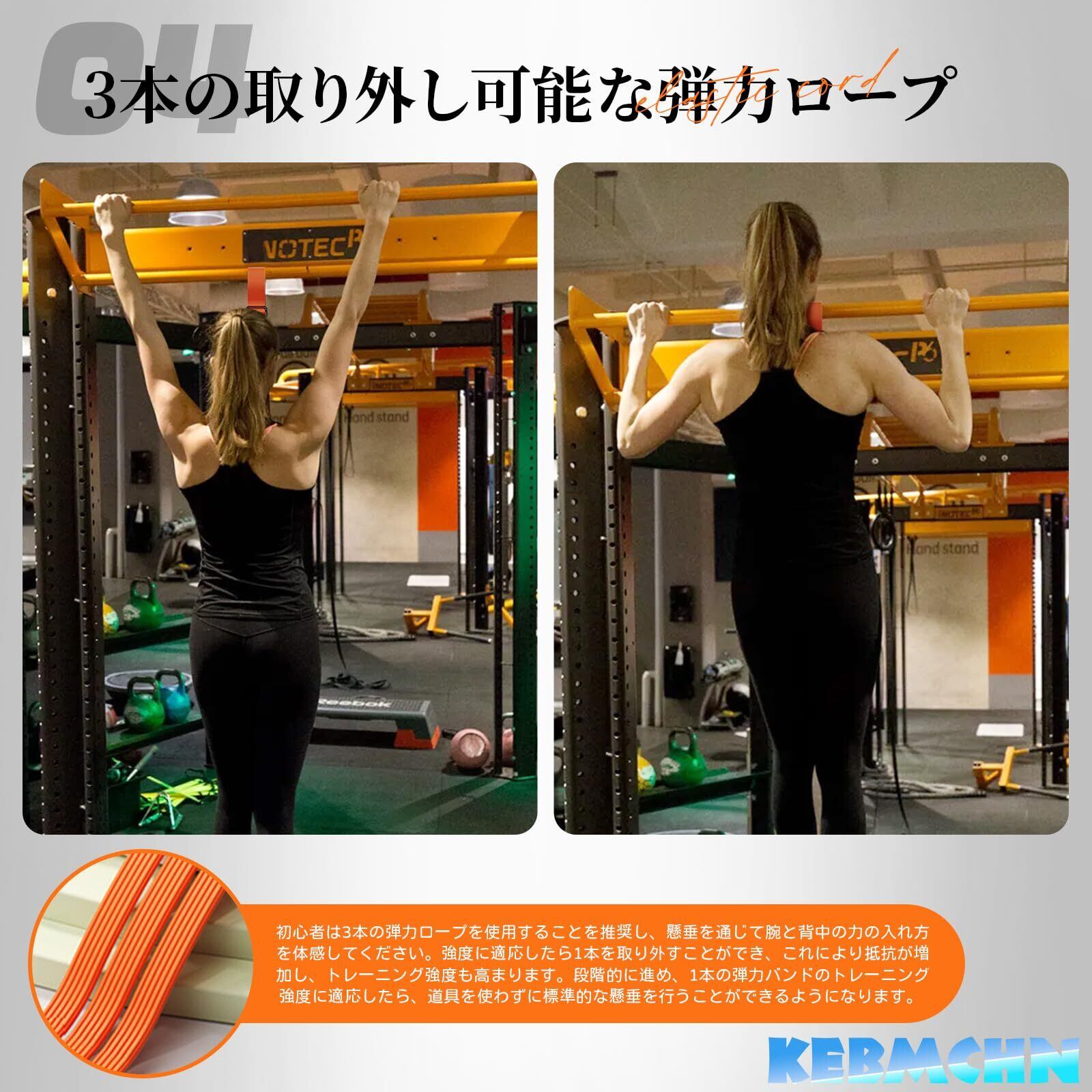【3本の取り外し可能な弾力ロープ】 :初心者は3本の弾力ロープを使用することを推奨し、懸垂を通じて腕と背中の力の入れ方を体感してください。強度に適応したら1本を取り外すことができ、これにより抵抗が増加し、トレーニング強度も高まります。段階的に進め、1本の弾力バンドのトレーニング強度に適応したら、道具を使わずに標準的な懸垂を行うことができるようになります。