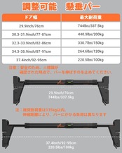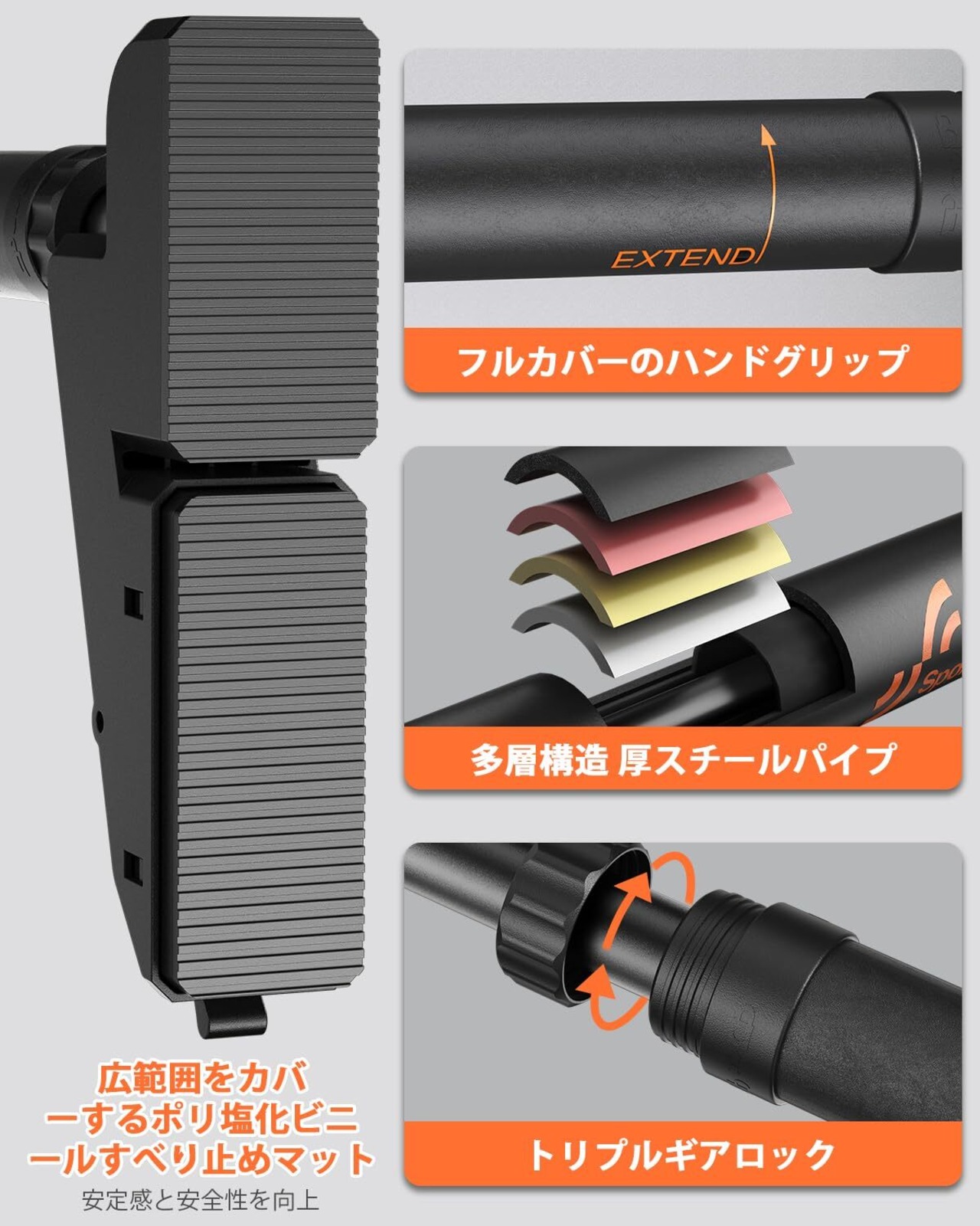 強力な耐荷重構造: 2mmのスチールパイプと1.5mmのインナースチールパイプを採用。保護構造と大型の滑り止めパッドにより、最大重量337.5kgを実現しました。長期間の使用も安心です。(注:推奨耐荷重は135kg以内。伸縮距離により、バーにかかる負荷は異なります)