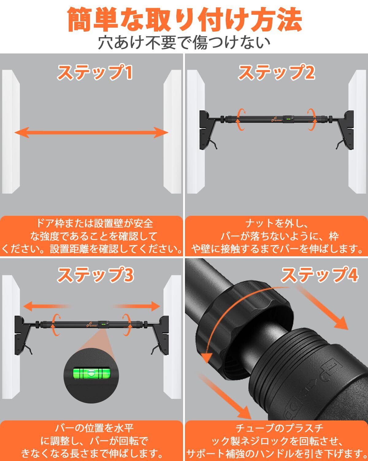 4ステップの簡単取り付け:精確な水準器が搭載され、設置作業も簡単です。好みの長さと高さに調整するだけで、準備は完了です。(注意:設置前に必ず、玄関や壁の耐久性、バーを支える十分な強度があるかを確認してください。タイルやガラスなど、非堅固な構造物への設置は避けてください。)