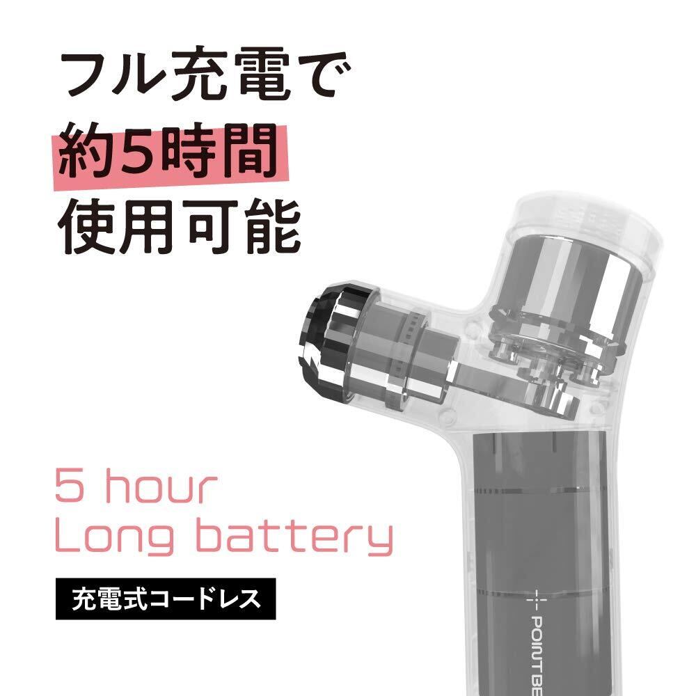 充電式コードレス。POINTBEATはスマホの様にこまめに充電する必要はありません。たっぷり使える長時間バッテリーを採用しているので。フル充電しておけば約5時間、1回15分使用した場合でも約20回も使えます。また、バッテリー充電お知らせランプで充電忘れも防げます。