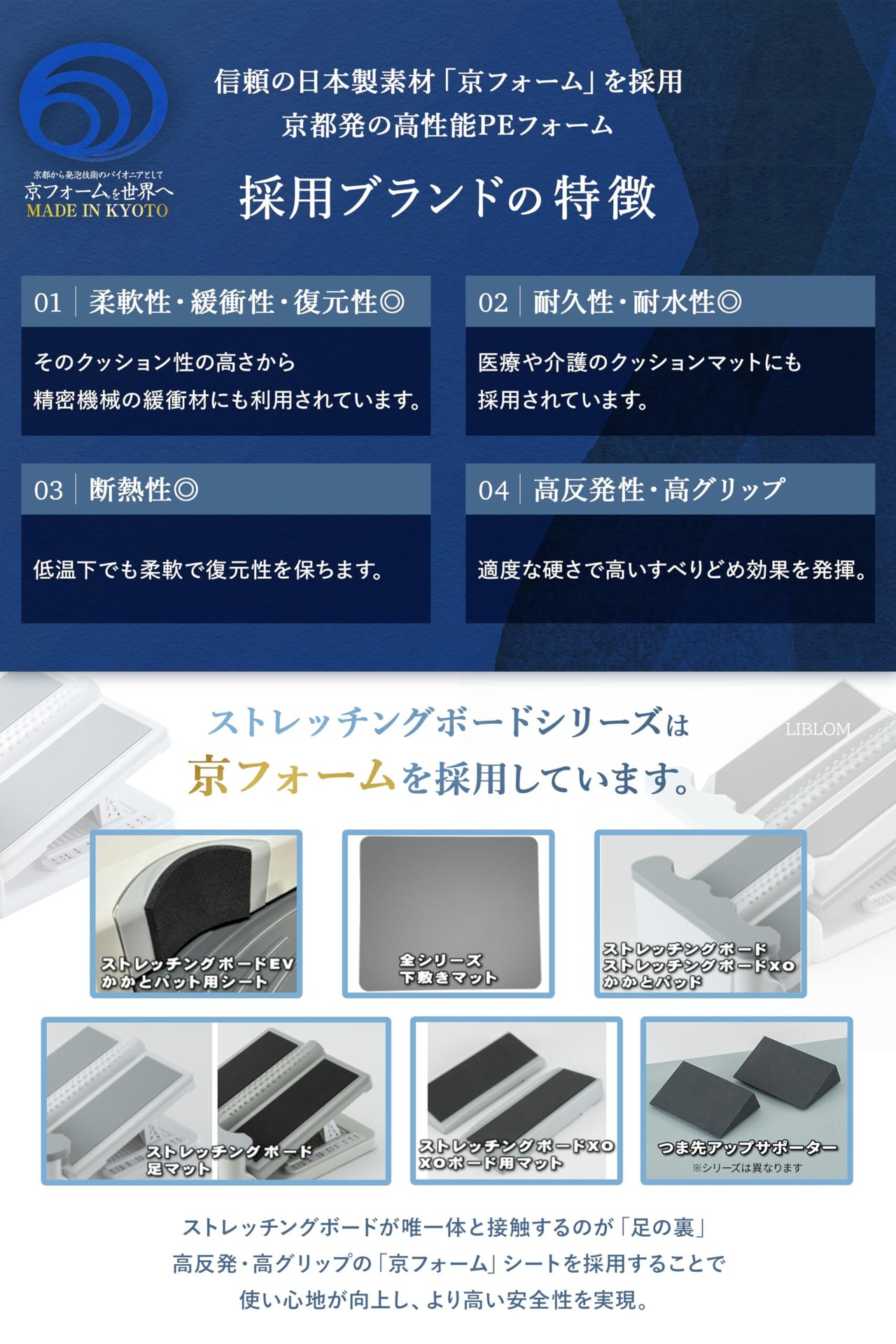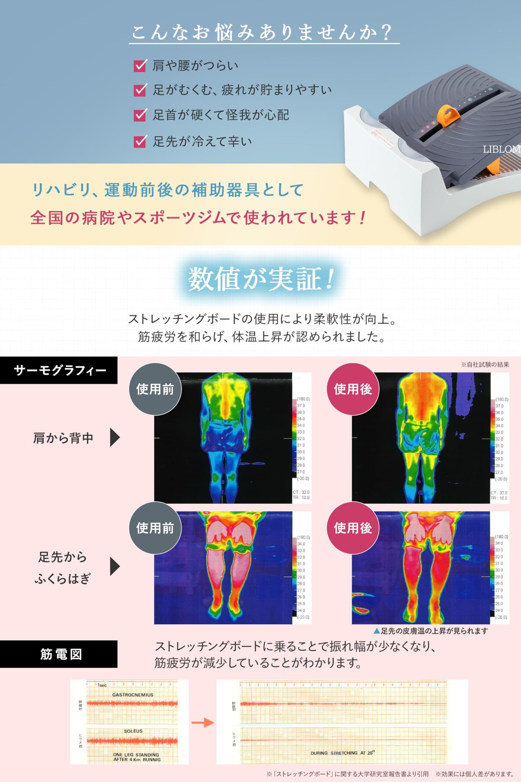 【 安心の日本製&エビデンス実証済み 】成型から組み立て梱包まで全て日本国内で行っています。硬度・剛性・耐衝撃性に優れたABS樹脂を使用し、どなたでも長く使えるものを作りました。またストレッチングボードの使用により柔軟性が向上し、筋疲労を和らげ、疲れの溜まりやすい下半身をしっかりストレッチすることができます。