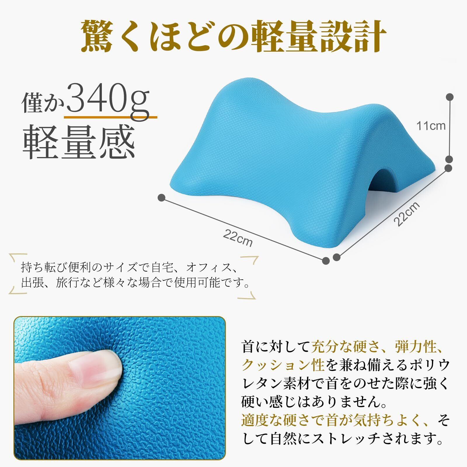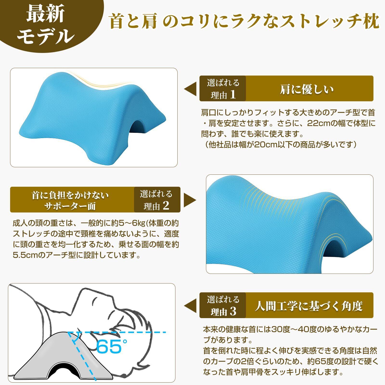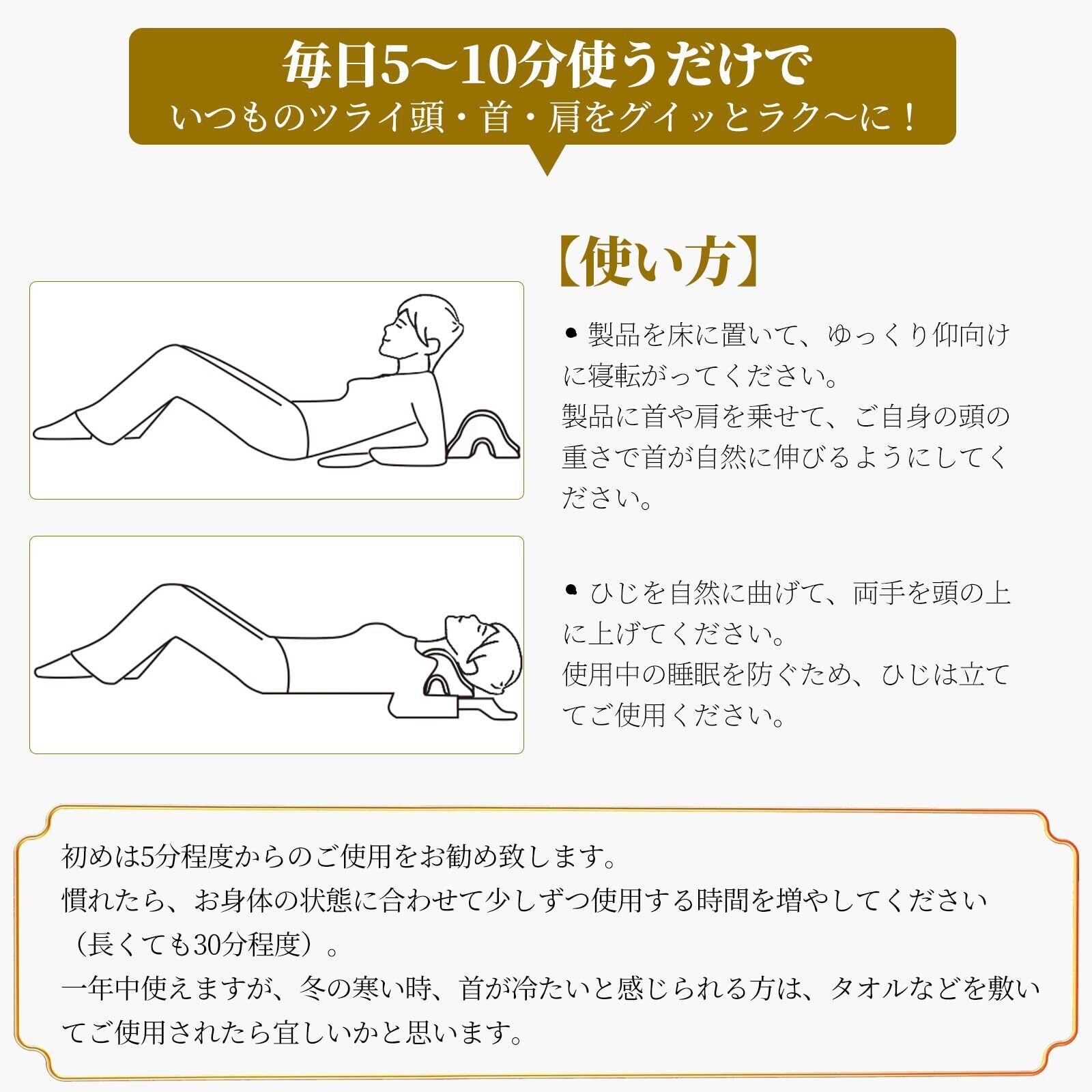 【使用便利グッズ 】 床に置いて首を乗せるだけご使用いただけます。ストレッチの途中で頸椎を痛めないように、適度に頭の重さを均一化するため、乗せる面の幅を約5.5cmのアーチ型に設計しています。頭の重力で首や肩周りを伸ばし、首・肩周りをケアするネックピローです。