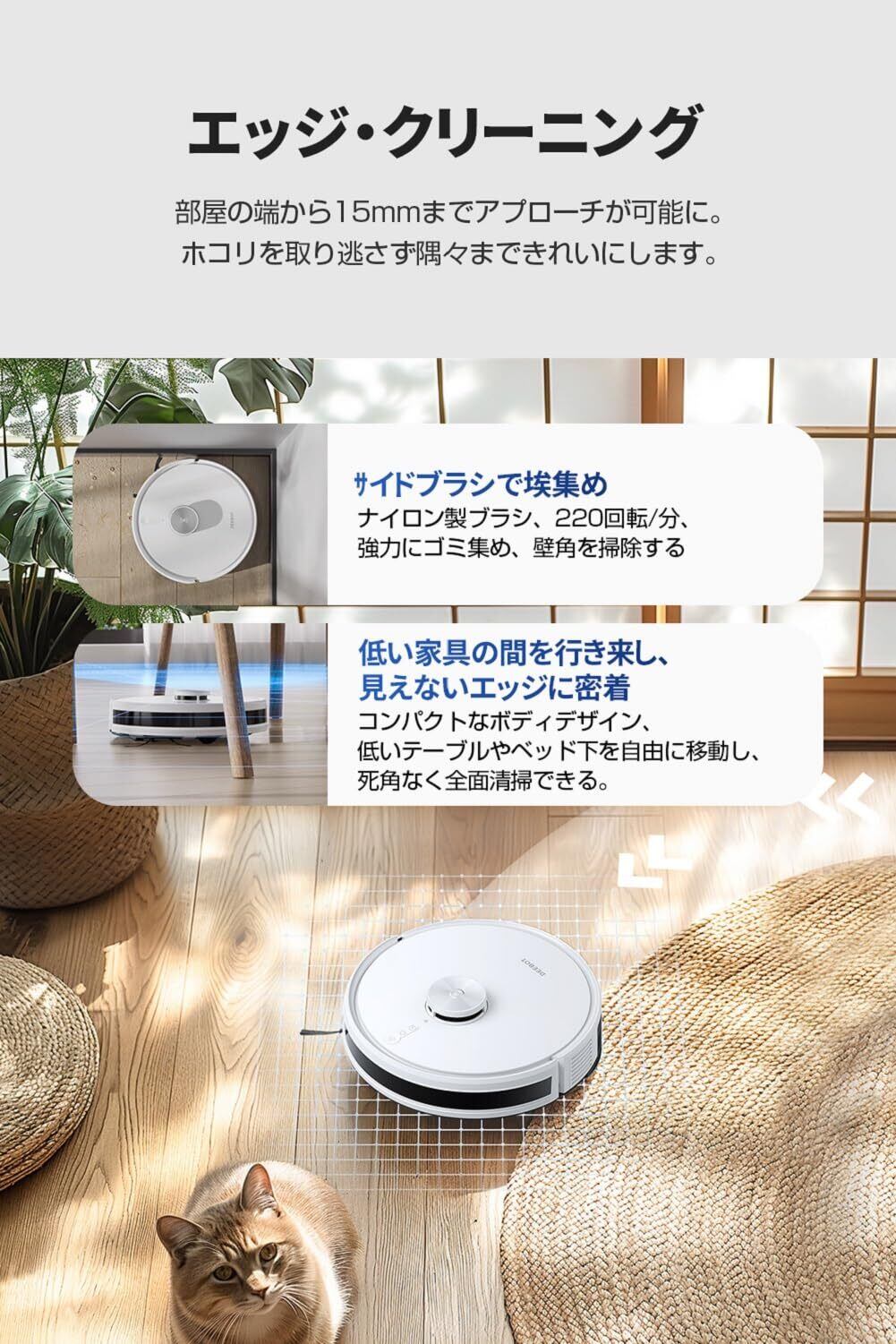 【パワフルな清掃力&静音】強力吸引力5,000Pa。カーペットの毛の奥に入り込んだペットの毛やホコリはもちろん、重みのあるゴミも超強力な吸引力で根こそぎ吸い取ります。また、カーペットに乗り上げると自動で吸引力をマックスモードに変更し清掃を行います。また、最適化されたブラシ素材と吸引口構造の設定で動作音はとても静か、リモートワーク中も気になりません。