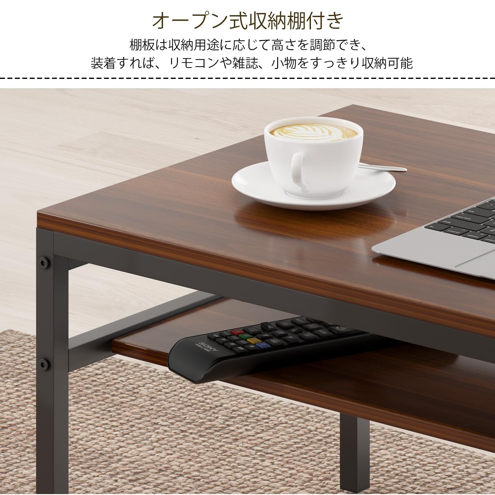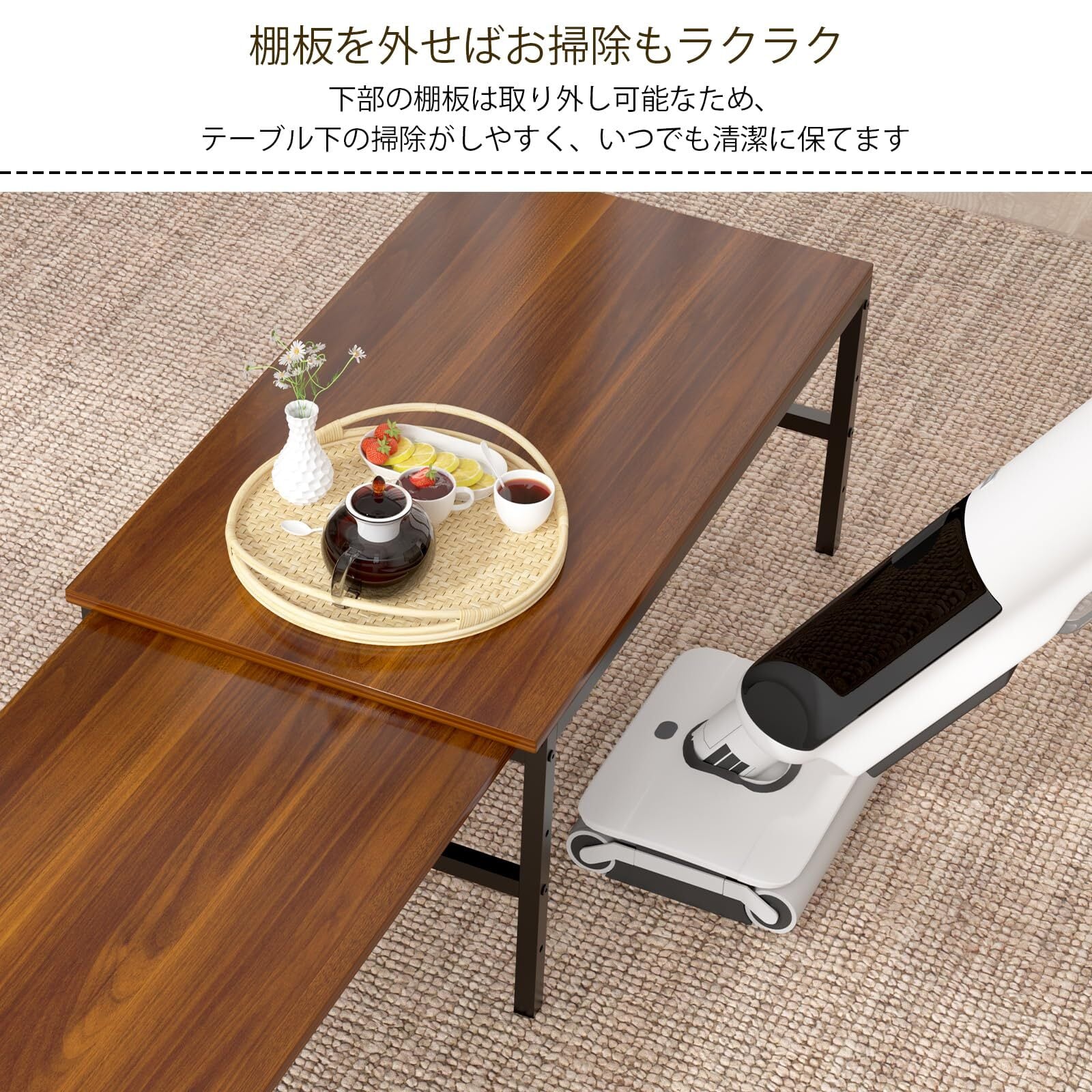 【使用シーン】ローテーブルや座卓として、スペースを取らずに棚板収納を実現。このテーブルは、座卓利用時にお客様の身長に合わせて特製の可動式の2段棚板が特徴。脚を邪魔させないよう、幅と高さを調整可能なデザインにしました。雑誌や小物、ティッシュケースなどを手軽に収納でき、コンパクトながら機能的です。スチールフレームと木製の棚板が組み合わさったデザインで、狭いワンルームにもぴったり。高さは約35cmで、ソファや座椅子と合わせやすく、お部屋に自然に馴染みます。掃除機やロボット掃除機も通れる高さ設計です。高さ調整や、床傷防止用のフェルト付きでがたつきを防止。お部屋をスッキリ保ちながら、快適に過ごせます。