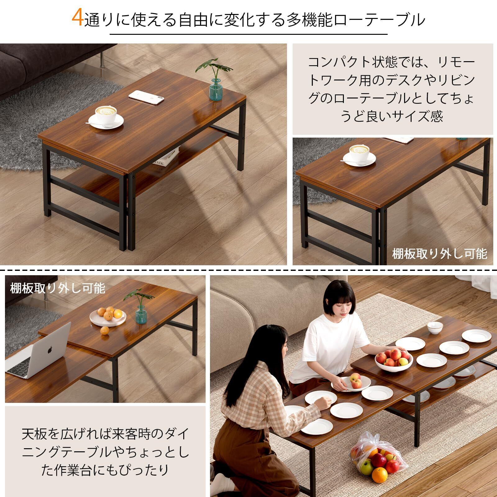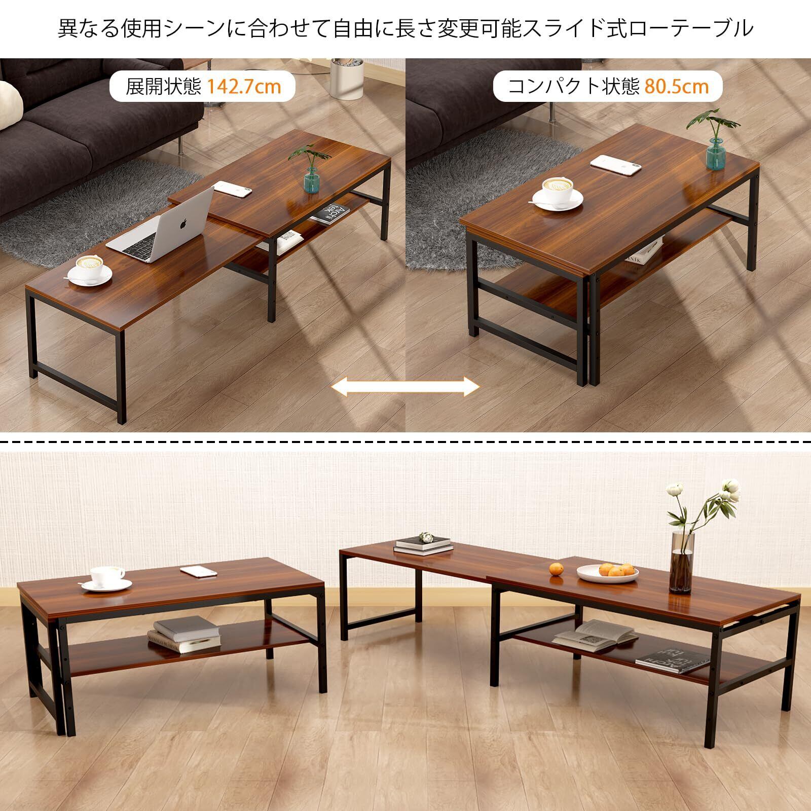 LunarLight ローテーブル 幅伸縮80-140奥行45高さ35cm 無段階で調整できる伸縮ローテーブル センターテーブル リビング 机 座卓 コンパクトデザイン 収納棚板の高さ可動式 床傷防止用のフェルト付き 強度安定 錆び防止 耐摩擦性 耐水性 耐熱性機能 (ダークブラウン, 幅80.5cm)