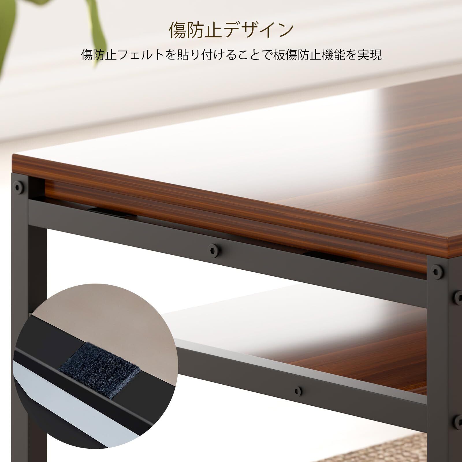 【安全構造】日本デザイン頑丈構造、天板と棚板はネジ止めにより確実に固定されており、長期間にわたって緩みを防止しています。スチルフレームについて他社と違って、横パイプサポートがあります。床傷防止用のアジャストフェルトも付いてます。
