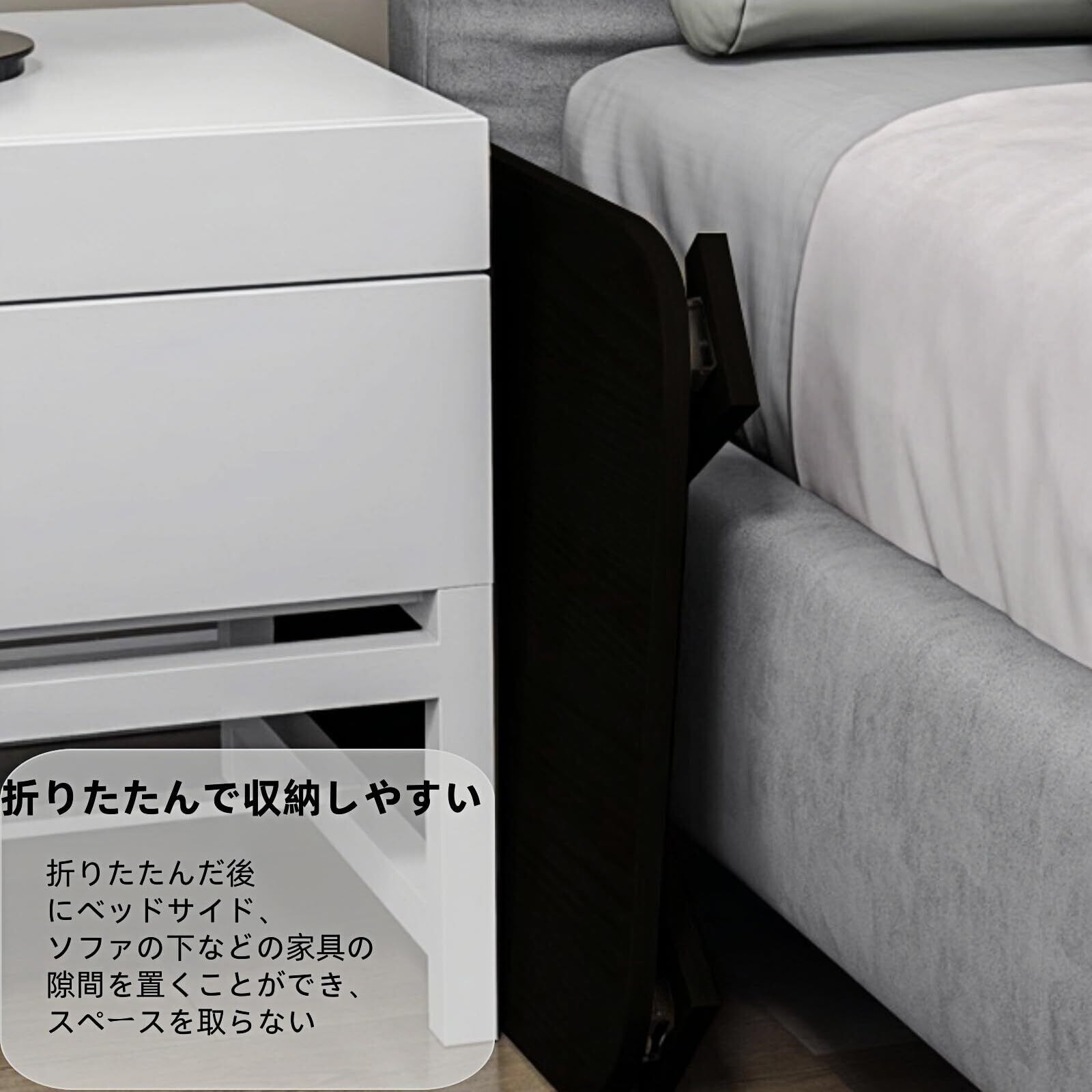 & 省スペース,ロックを押して外したら、内側へ倒せば楽にたためます。折りたたむと高さ6cmになるので、使わない時は折り畳んでソファやベッドの下などちょっとした隙間に収納できます,コンパクトに収納できる。