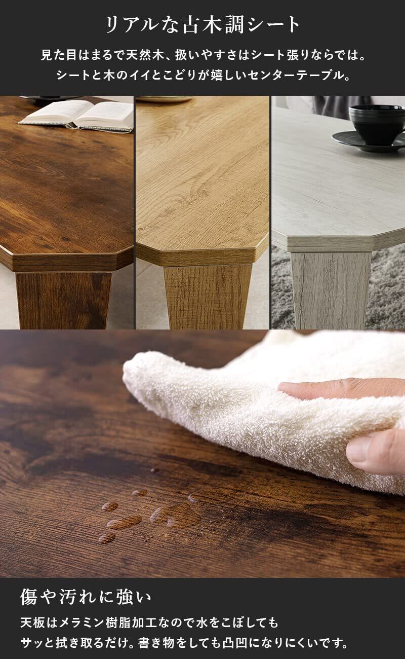 【ヴィンテージ感のある木目調ローテーブル】:リアルな古木調シートを天板に使用し、見た目はまるで天然木のように仕上げました。シートなので耐水性はバツグン。サッとふき取り、お手入れ簡単です。