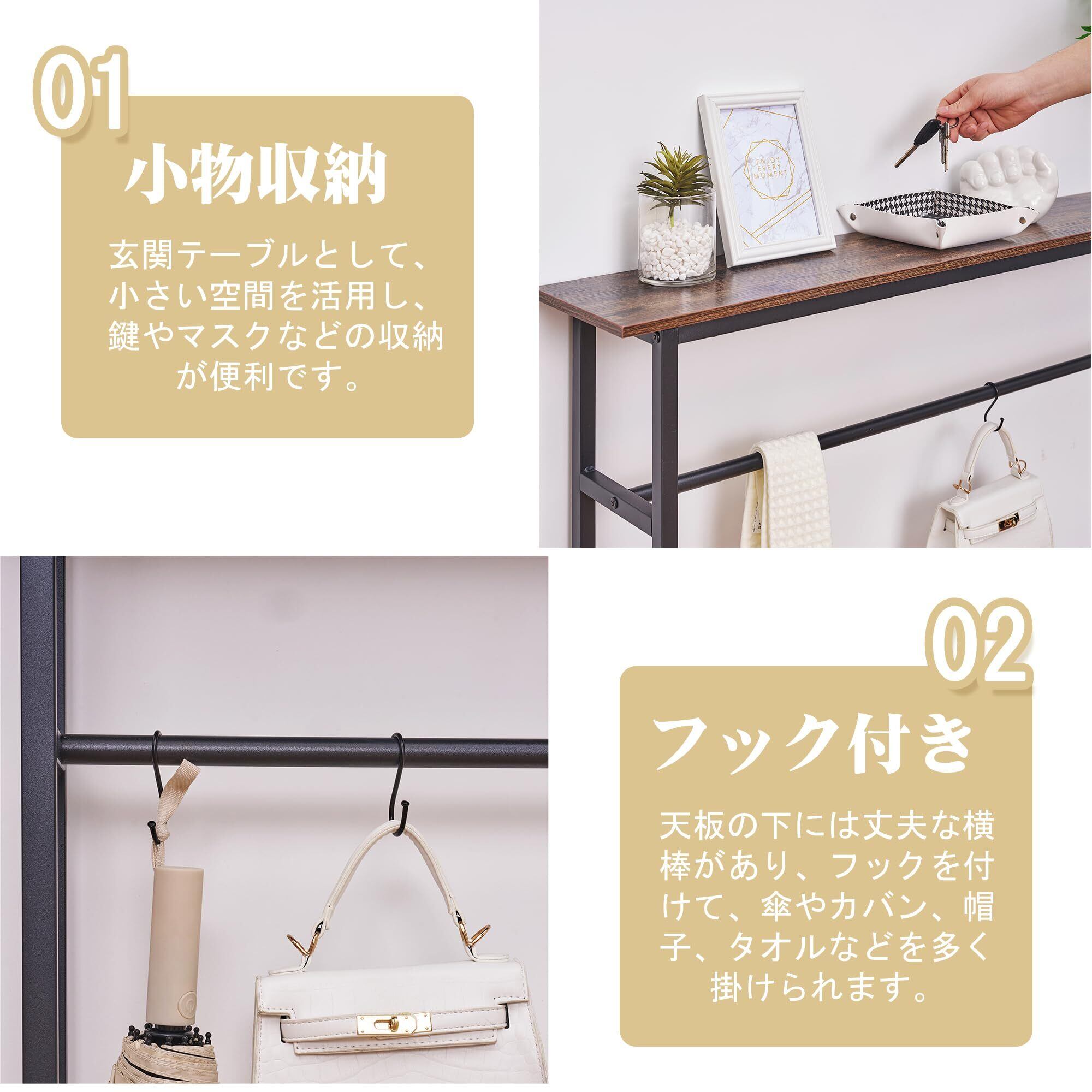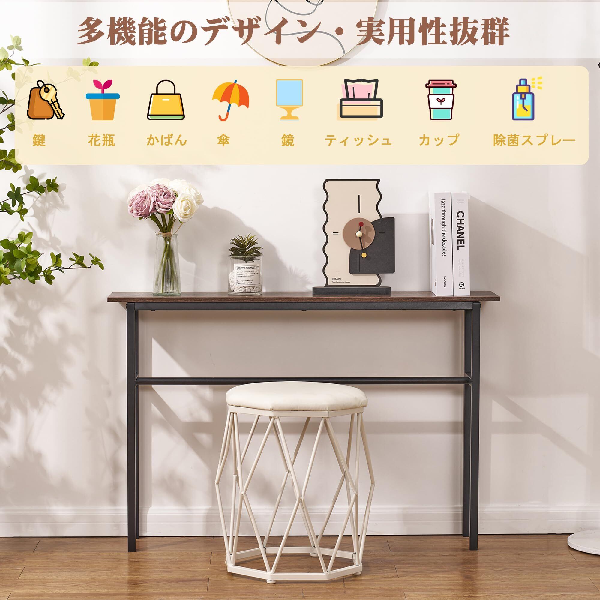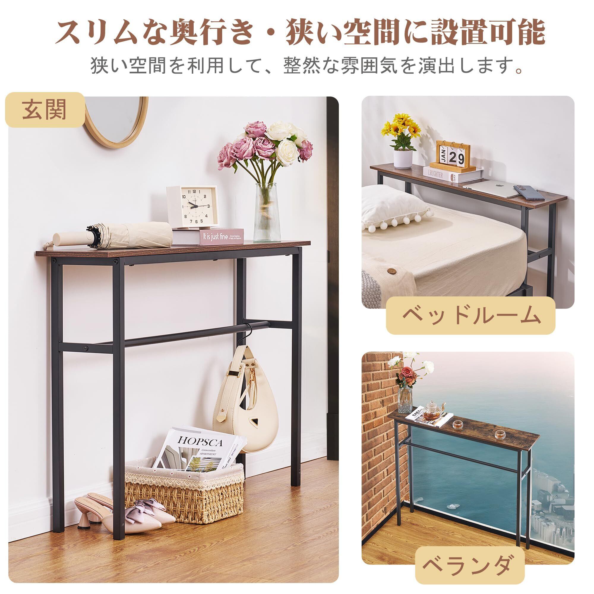 【組立簡単・多用途なデザイン】このコンソールテーブルはシンプルなデザインなので、組み立てが簡単で、初心者でも気軽に完成できます。そして、このコンソールテーブルは構造が簡単だが、多くの物が収納できます。たとえば、鍵、カバン、帽子、雑貨、本、植物、収納ボックス、装飾品、アートワーク、絵画、写真など、狭い空間で大いに役立つことができます。