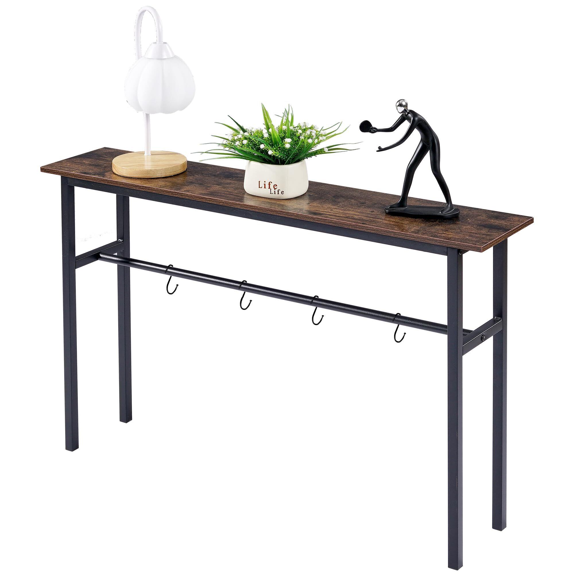 VECELO コンソールテーブル スリム 幅100X奥行20x高さ65cm 玄関テーブル フック付き 飾り棚 省スペース 木目調 組立簡単 安定性 頑丈 シンプル 細長い 玄関収納 ダイニング 玄関机 スリムテーブル 鍵 廊下 ソファー裏 リビング 金属フレーム