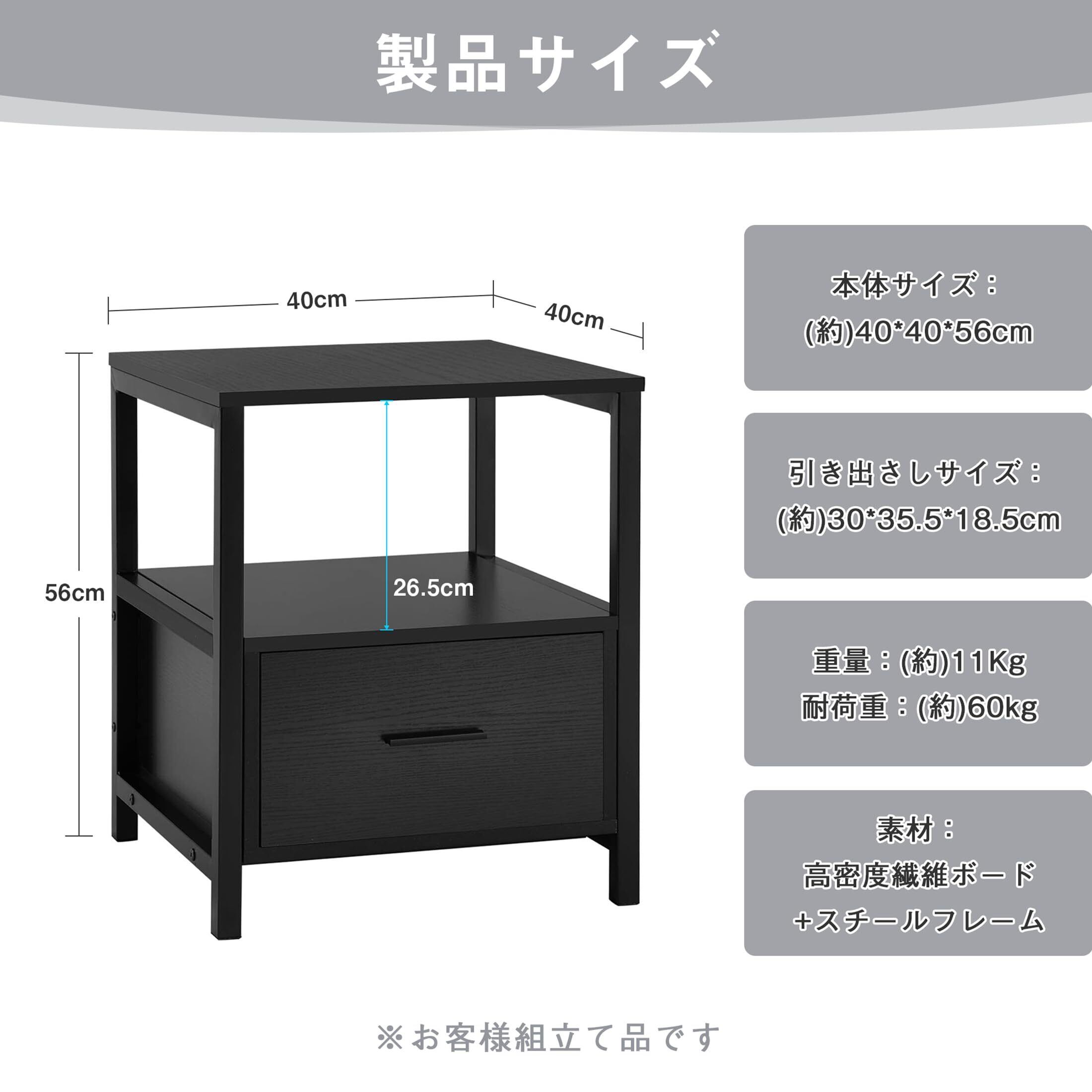 【サイズ】(約)幅40cm x 長さ40cm x 高さ56cm。【重量】(約)11Kg。【素材】高密度繊維ボード+スチールフレーム。※お客様組立て品です。【組立アドバイス】各部のボルトはゆるく仮締めして組立てし、組立て完成後にしっかりと締め付けると組立てやすくなります。