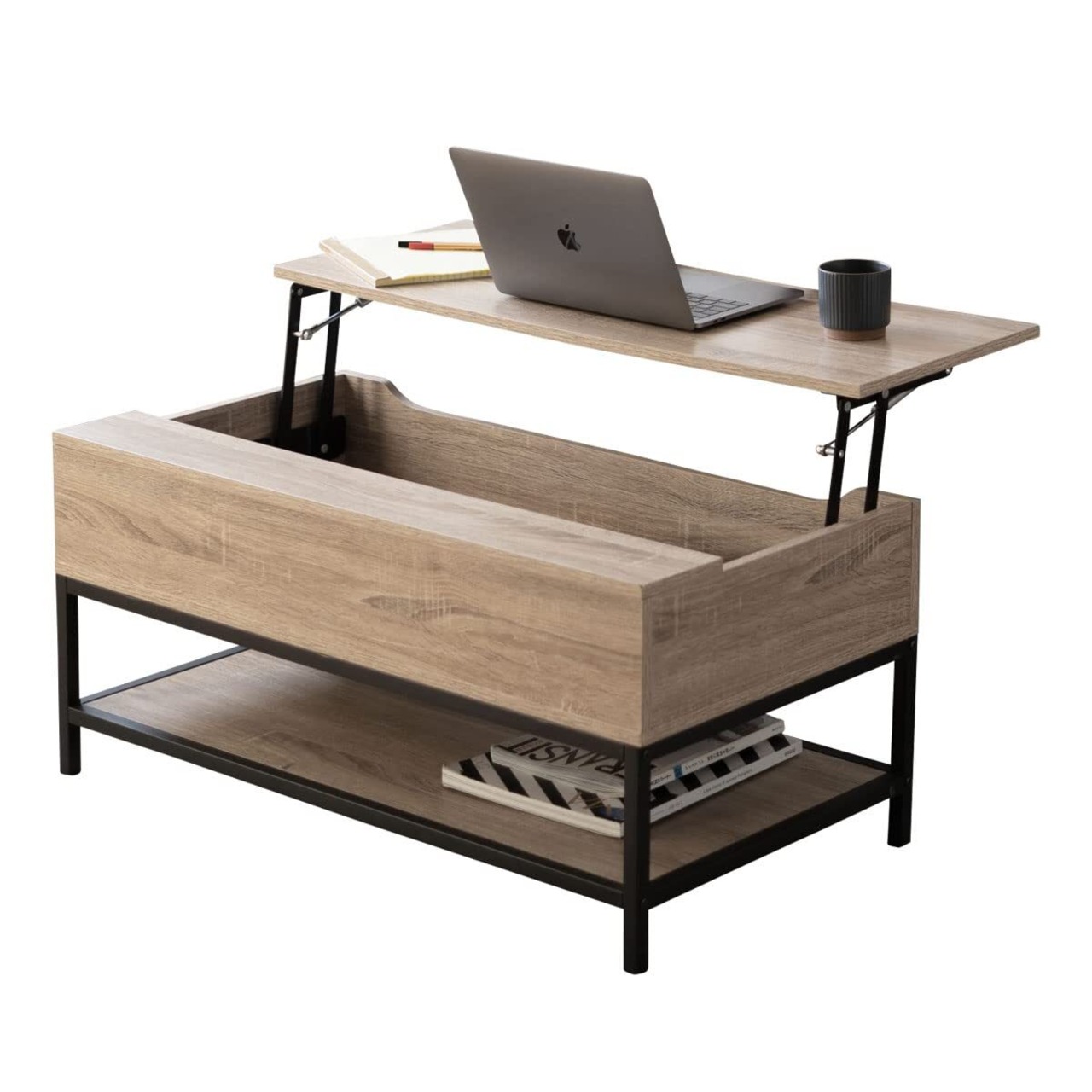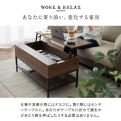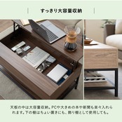 Point2.リビングが書斎に早変わり 天板を持ち上げれば2秒でワークスペースが出現。 ソファに座ったままPCや読書などの作業が快適に行えます。 天板はPCやノート、コーヒーセットが置けて広々。 使わないものは天板下に収納にできます。
