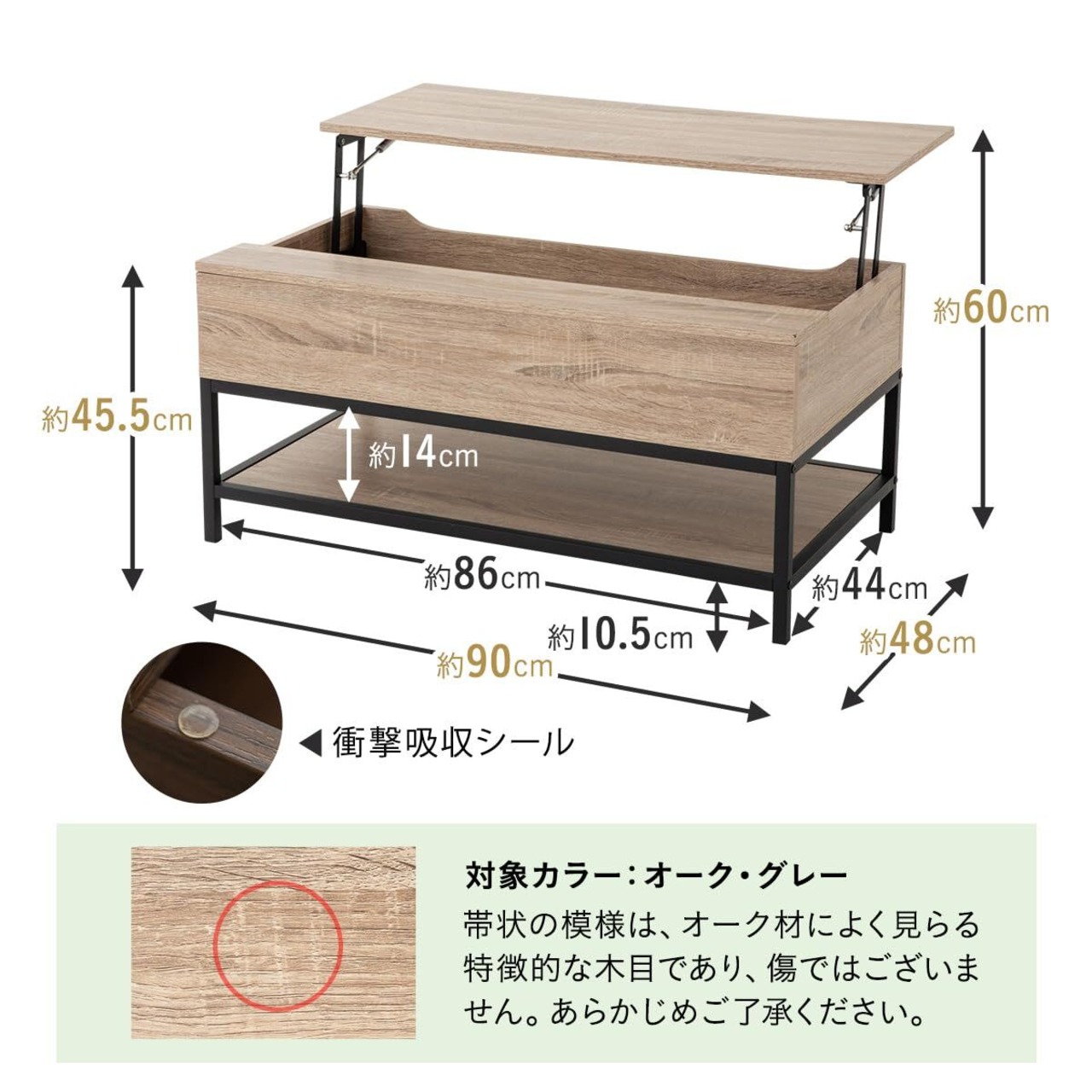 【サイズ】 約幅90×奥行48×高さ45.5-60cm リフトアップ天板:約幅90×奥行35cm 収納部:約幅87×45cm 【カラー】 オーク 【材質】 プリント強化紙合板 スチール(粉体塗装) 【耐荷重】 天板:約20kg 昇降天板:約7kg 収納部:約10kg 【組立所要時間】 約45分