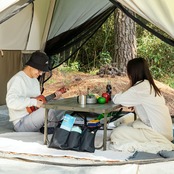 【注意事項】:こちらのアウトドーアテーブルは折りたたんで収納するため、展開後に2枚のテーブルボードの間にわずかな山折りが生じるのは正常な現象であり、製品の品質上の問題ではなく、使用には影響しません。ご購入前にご了承ください。