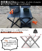 【安定性】キャンプテーブルはアルミニウム製の「X」型構造で設計されており、軽量でありながら丈夫と安定性を同時に備えています。 天板単体の耐荷重は10kgで、全体の耐荷重は30kgまで、キャンプ中に重いものを置いても問題ない。