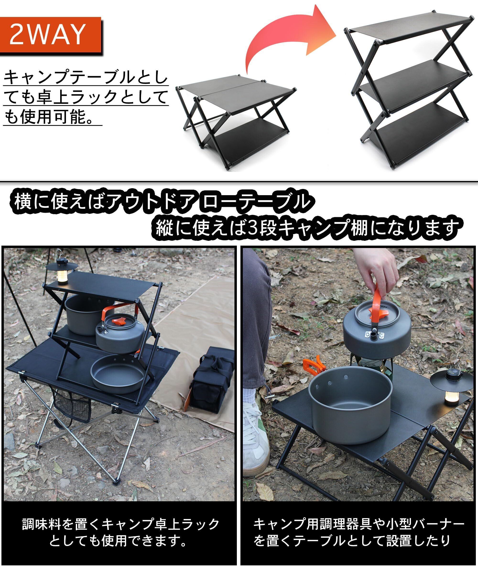 【2way】キャンプテーブルとしてもキャンプ棚としても使用可能。横に使えばアウトドア ローテーブル、縦に使えば二段キャンプ棚になります。使用シナリオやニーズに応じて、キャンプ用調理器具や小型バーナーを置くテーブルとして設置したり、調味料を置くキャンプ卓上ラックとしても使用できます。