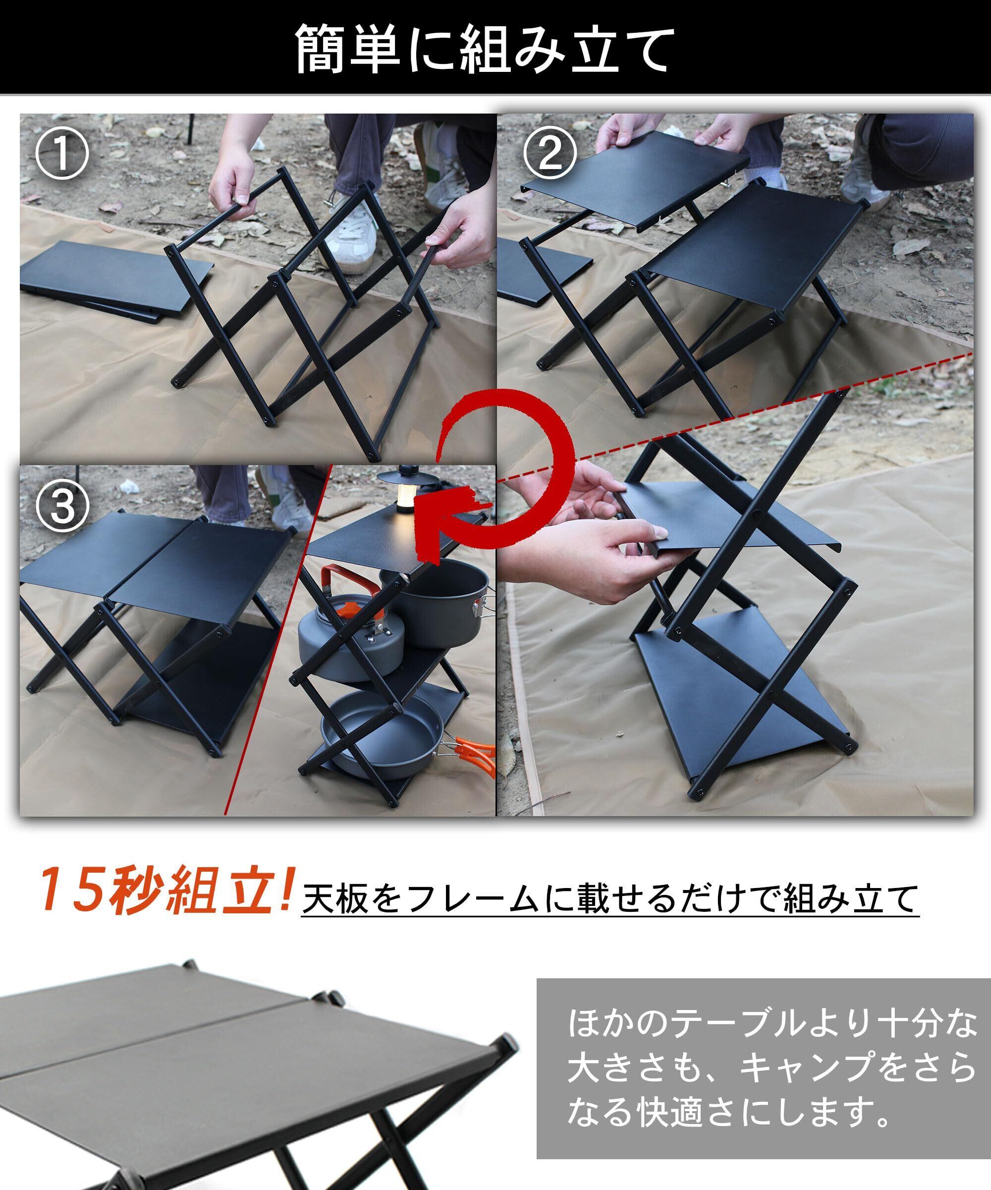 【組立ても簡単】フレームを広げて天板を乗せるだけで完成する簡単組み立てで、設営も撤収も簡単。 ソロキャンプに最適なコンパクト設計で、持ち運びに便利な収納バッグも付属しています。