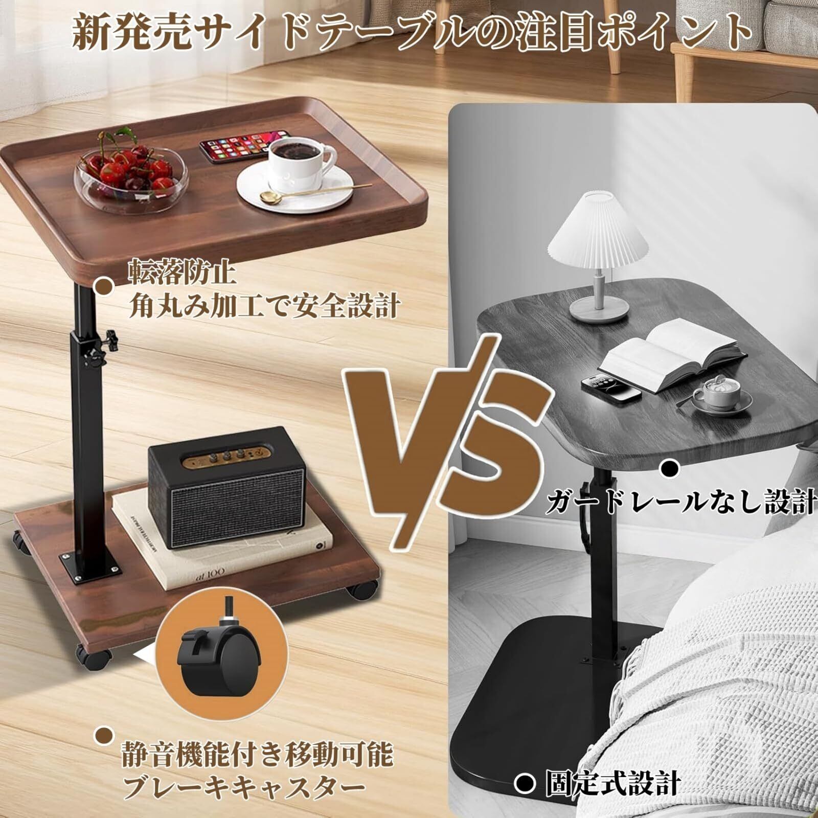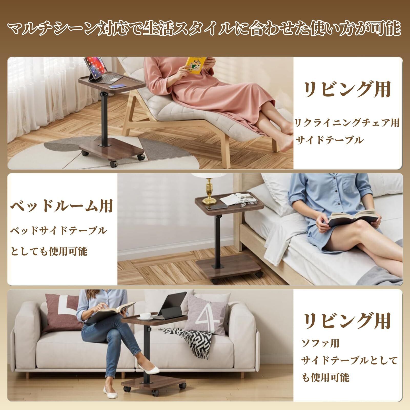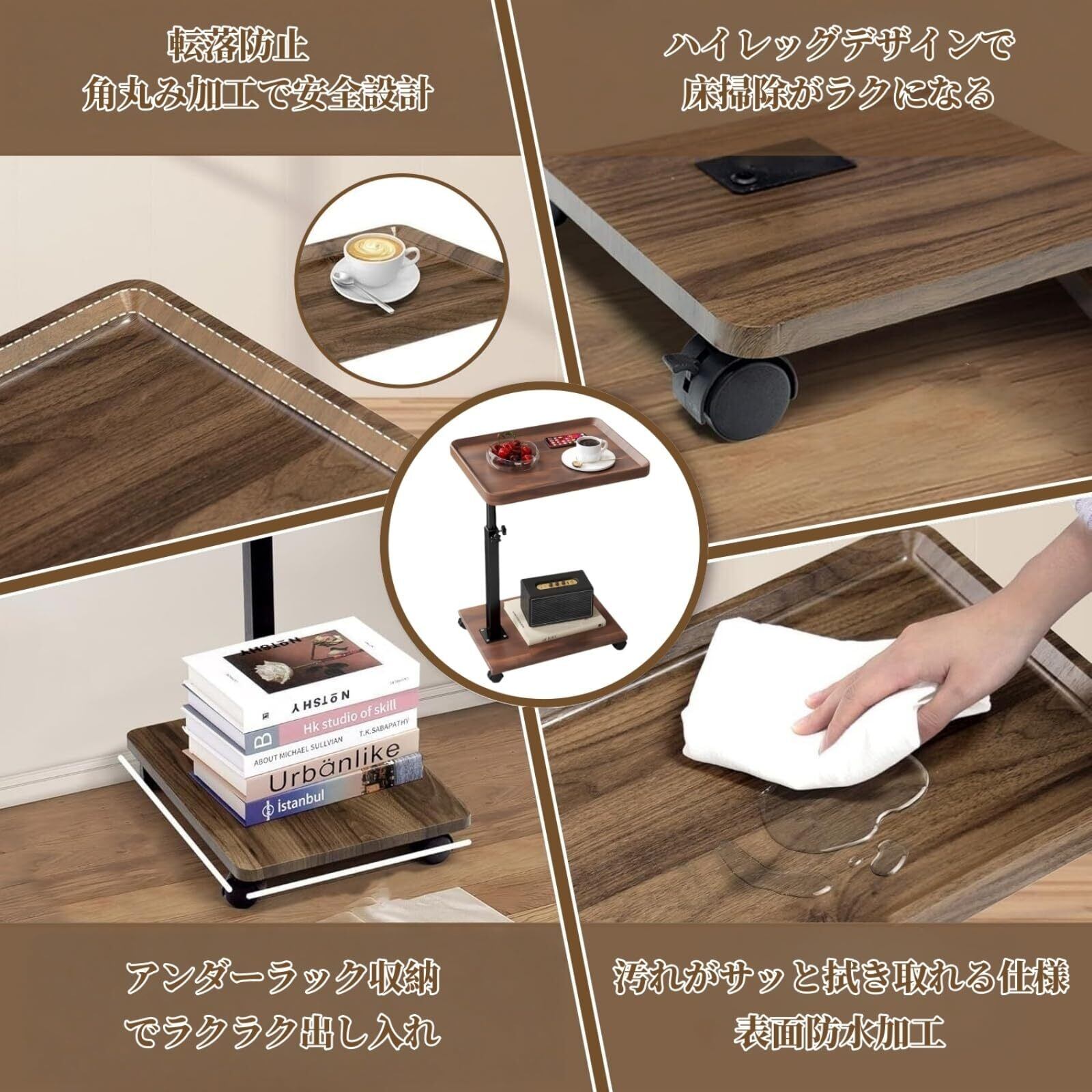 WoRefCra 昇降式 サイドテーブル キャスター付き 幅40×奥行30×高さ45-80cm ベッドサイド テーブル 木目調 C字型 簡易テーブル 小型 省スペース 移動便利 ウォールナットカラー