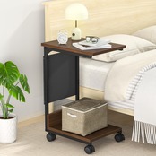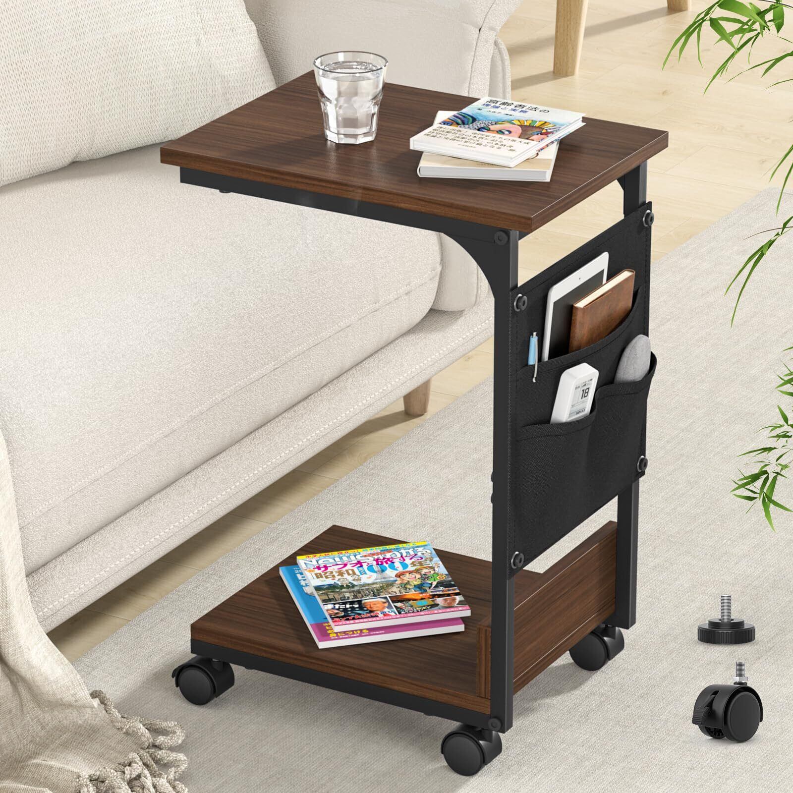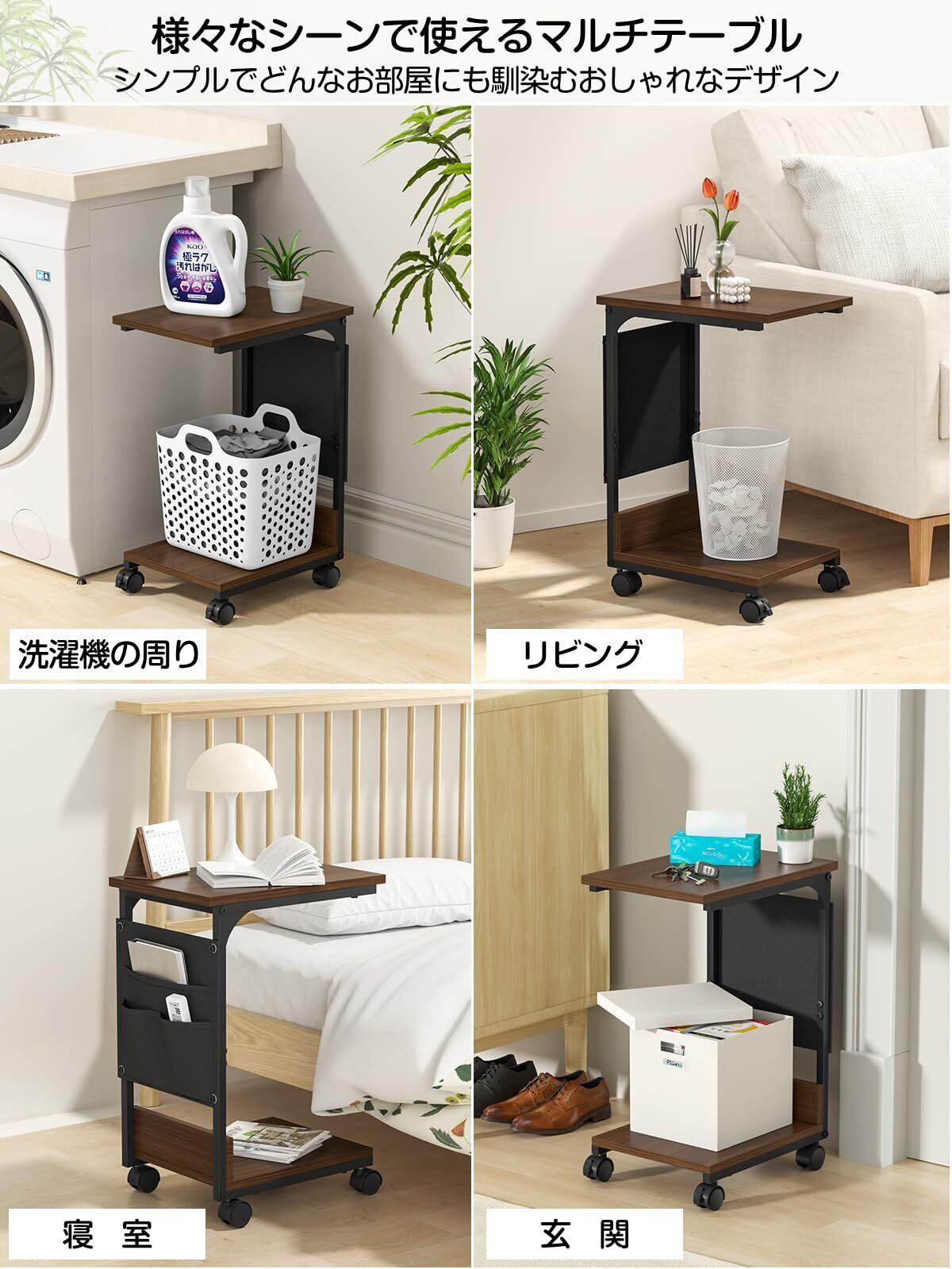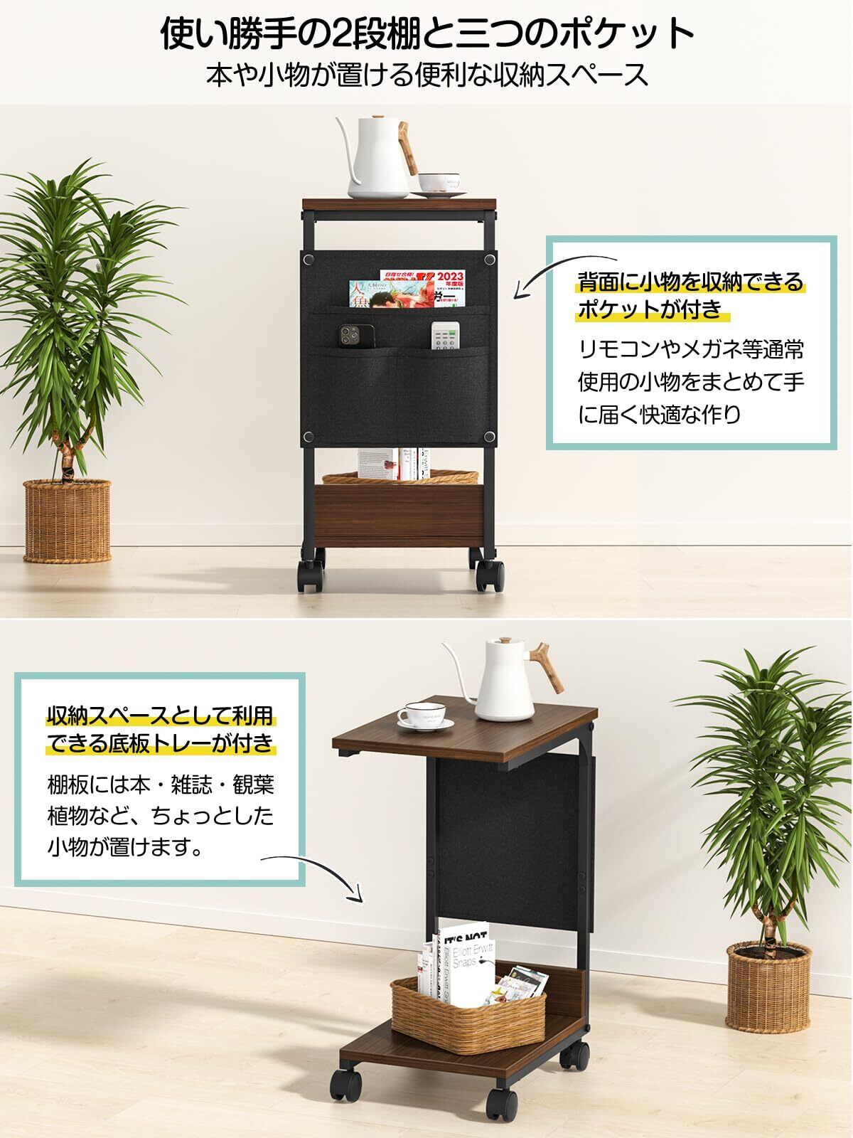 TTWO サイドテーブル W37×D26×H54cm ナイトテーブル 収納ポケット付き スリム リビングテーブル 介護 ソファー ベッドサイド テーブル キャスター・アジャスター両方付き コの字テーブル 北欧 モダン おしゃれ 小型 ミニテーブル (Brown)