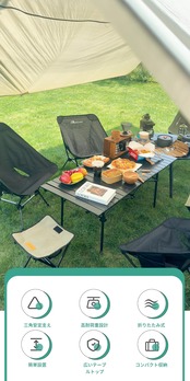 【3ステップ簡単設営|誰でも扱いやすい折りたたみ構造】フレームを開く → 側面ポールを取り付ける → 天板をセットするだけの組み立て簡単 テーブル。初めての方でも迷わずスムーズに設営できます。