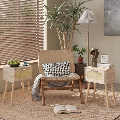 YMYNY ナイトテーブル サイドテーブル 籐編み前板 MDFボード 木目調 ラタン風 木製 脚付き おしゃれ 簡単組立 コンパクト ナイトスタンド ソファテーブル ベッドサイドテーブル サイドキャビネット 一人暮らし 和風 小物収納 寝室 玄関 ナチュラル HST010N