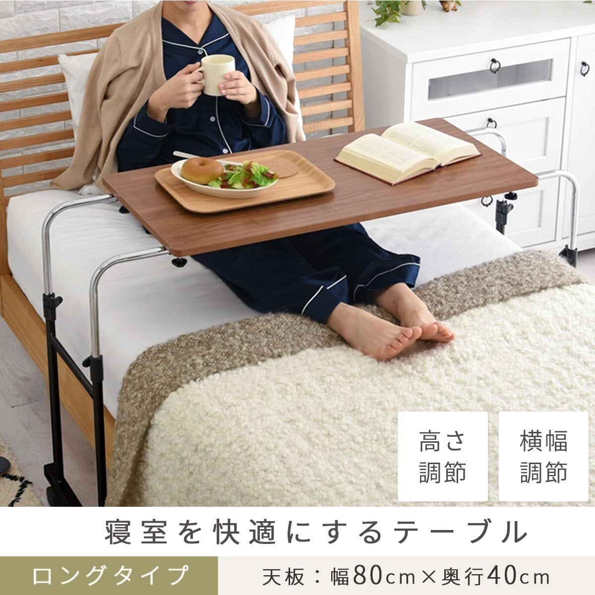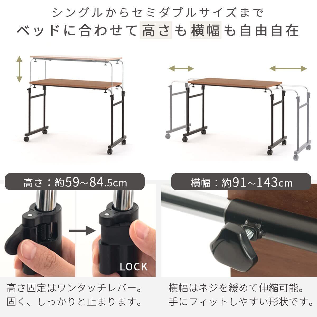 ぼん家具 ベッドテーブル オーバーベッドテーブル 介護 キャスター付き 高さ調節 伸縮 昇降式 ウォールナット
