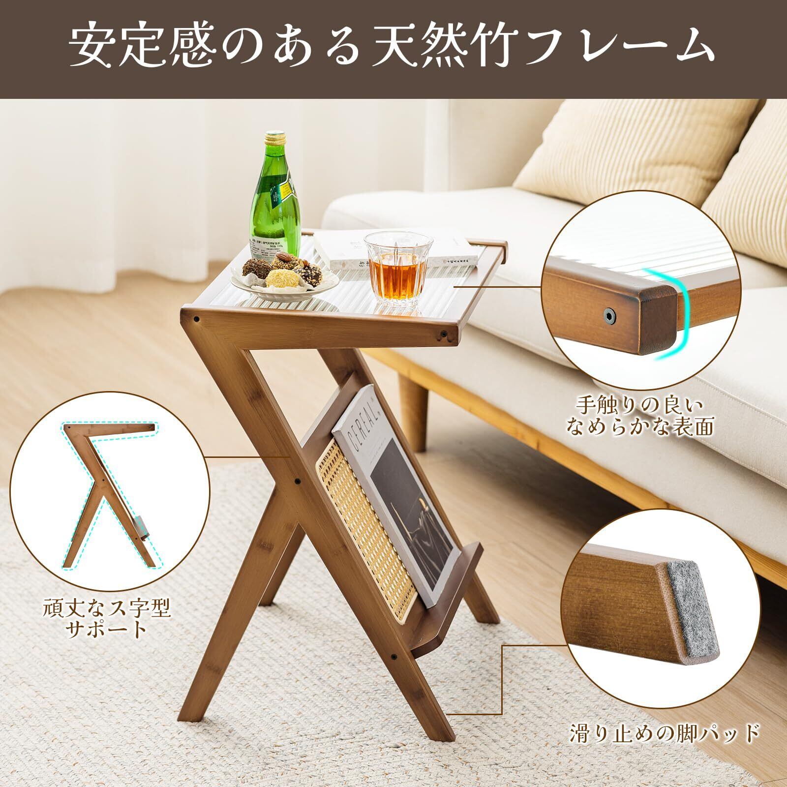 【安定感のあるつくり】天板には透明感のある強化ガラスを採用しており、見た目の軽やかさと実用性を両立しています。ス字型のフレームは丈夫な竹材でできており、高い強度を保ちながらも自然素材ならではの柔らかさを感じられます。重たい本や装飾品を置いても安定感があり、長く快適にご使用いただけます。