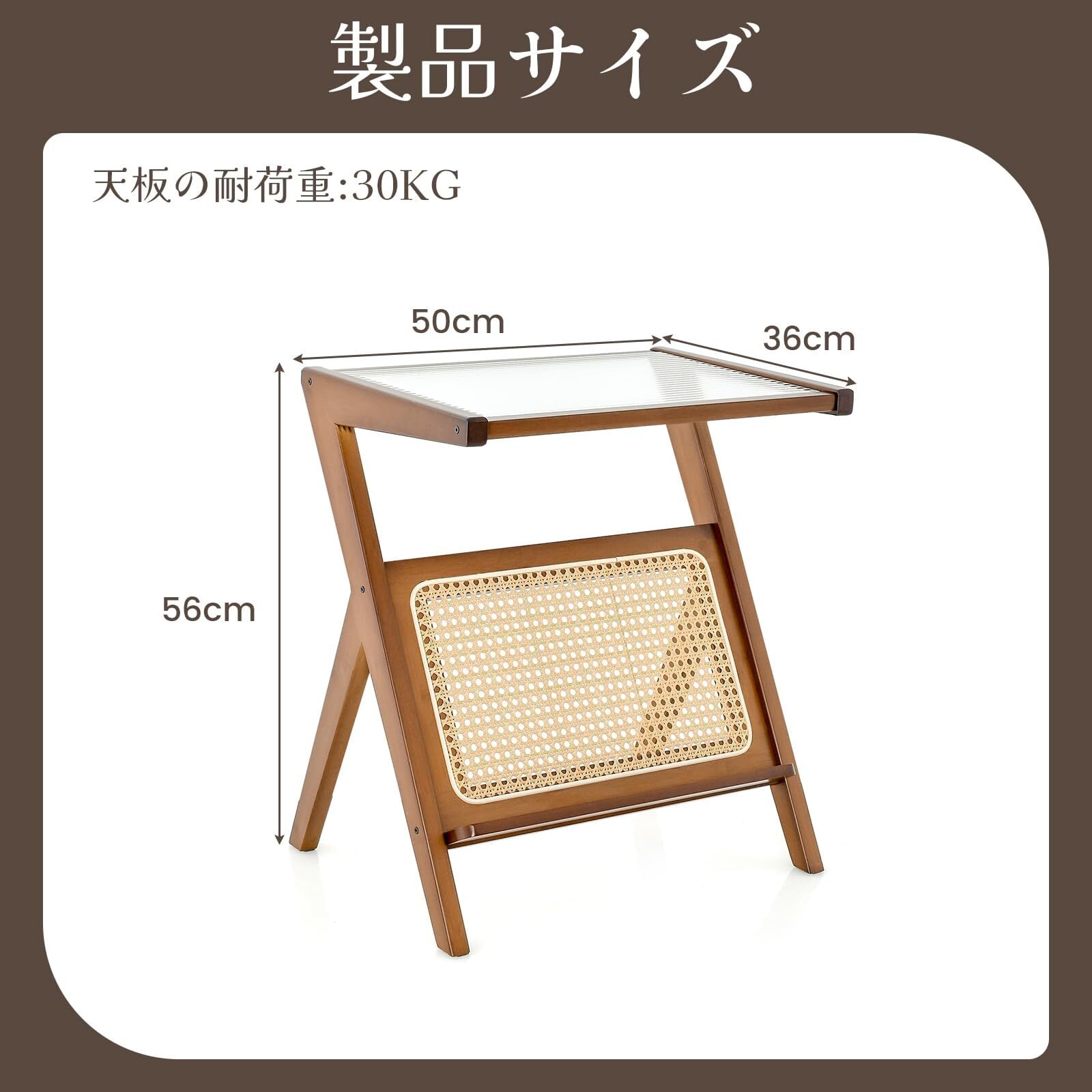 ●本体サイズ:幅50x奥行き36x高さ56cm●素材:天然竹、樹脂ラタン、グラス●天板の耐荷重:10kg●本体重量:4.2kg●カラー:ナチュラル