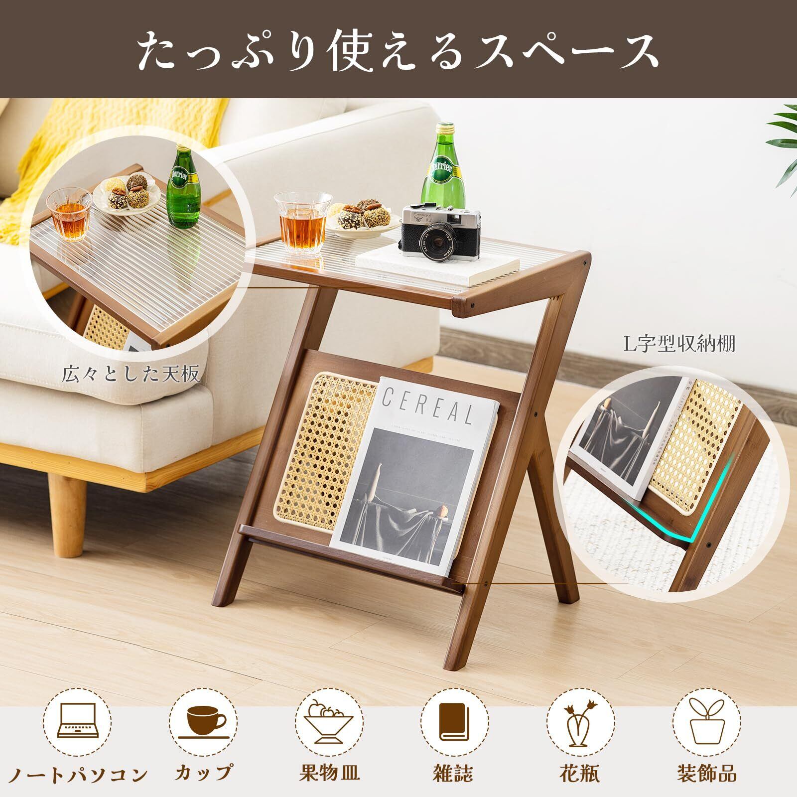 【雑誌やレコードもすっきり収まる】このサイドテーブルは、ス字型の構造を活かしたL字型の収納棚を備えており、雑誌やアルバム、レコードなどを立てて収納できます。上部のガラス天板にはカップや小物、照明などを置くことができ、コンパクトながらも高い収納力を実現しています。散らかりがちなリビングやベッドサイドを、スタイリッシュに整えることができます。