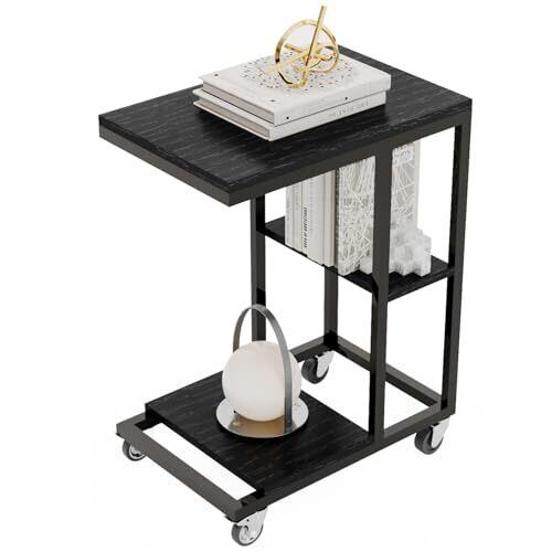 ZXD サイドテーブル ワゴン キャスター付きコの字型デザイン ベッド リビングサイドテーブル ソファ ブラックエンボス