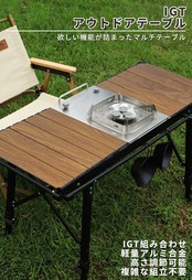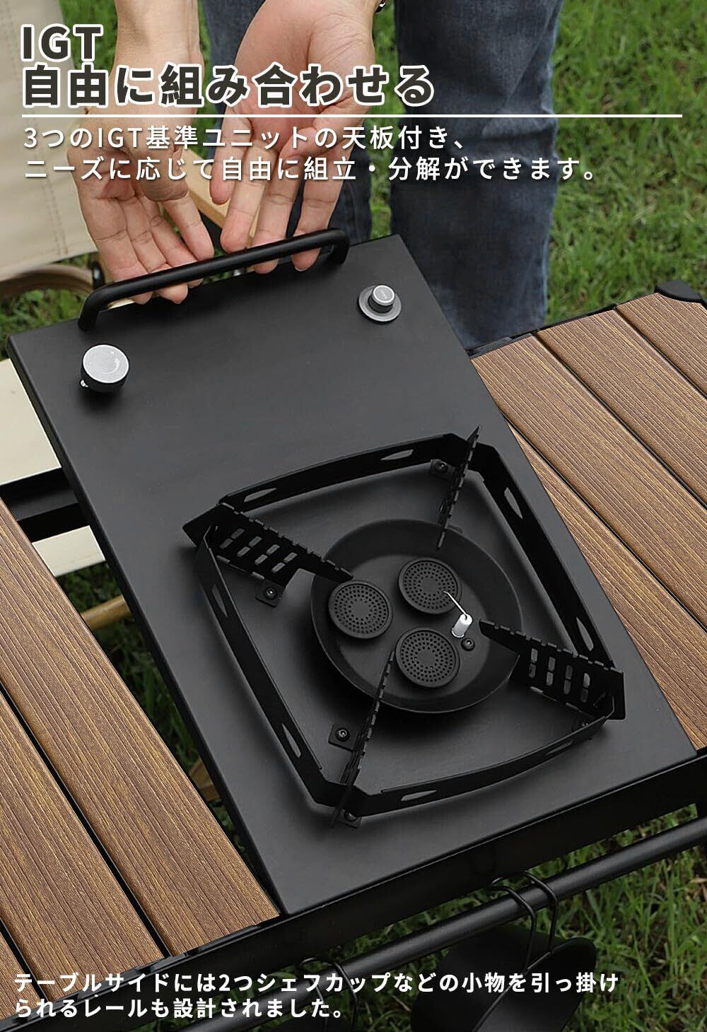 【IGT互換用で自由にアレンジ可能】IGTテーブルはどれも天板が取り外せる仕組みになっており、自由自在にアレンジできるのが特徴です。3つのIGTユニットの天板つき、ニーズに応じて自由自在にカスタムすることが可能です。バーナー、焚き火台、水切りかご、BBQコンロなどを合わせてご利用いただけます。さらにキャンプテーブルの側面には、吊り下げ用のサイドチューブも装備し、食器やキッチン用品などを掛けることができ、マルチキッチンテーブルとしても最適です。