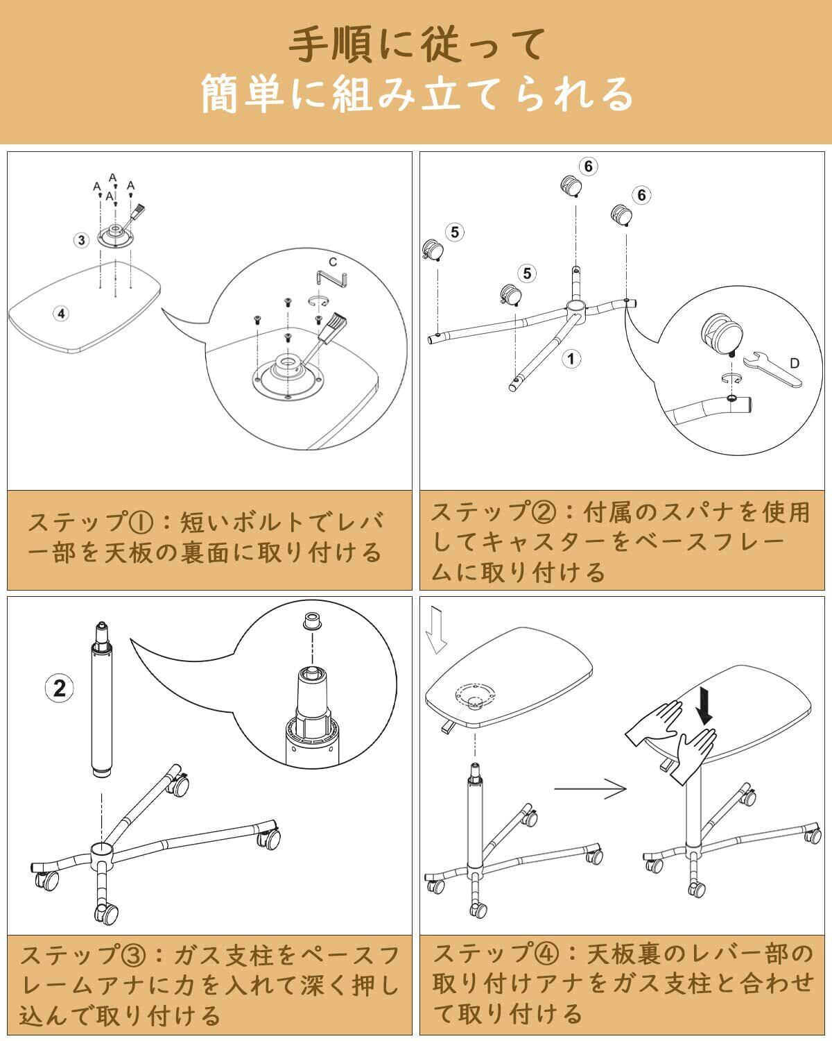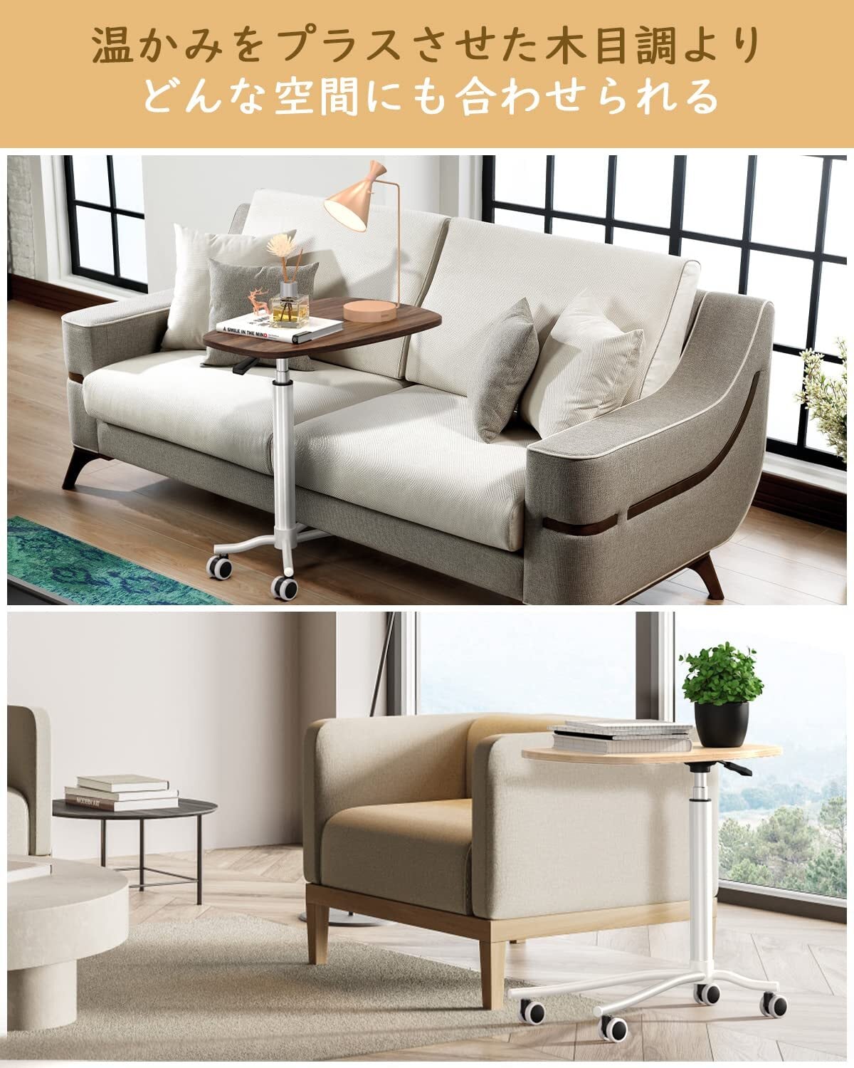 「オフィスチェアと同じ仕組みのガス昇降移動式」操作が軽いガス圧式レバー式を採用しており、シーンに合わせて、天板横に設置してあるレバーを引くだけで、550~810mmの高さを簡単に変えられて好きな位置に無段階で調節できます。ストッパー付きの4つのキャスター付き仕様に仕上がりで、必要に合わせて、様々な場所に移動できて、底部の掃除をしやすくなり、部屋の模様替えをするも楽にこなせて、 気分転換にも一役に立ってくれます。