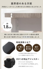 食事やワークスペースとしても快適にご使用いただけます。何をするにもちょうどいいサイズ感が魅力。折りたたみ可能なので、お掃除や来客時にはサッと収納できます。ちょっとした物を天板下に収納できる網棚付き。粉体塗装で水・傷に強く錆びにくいのも特徴です。