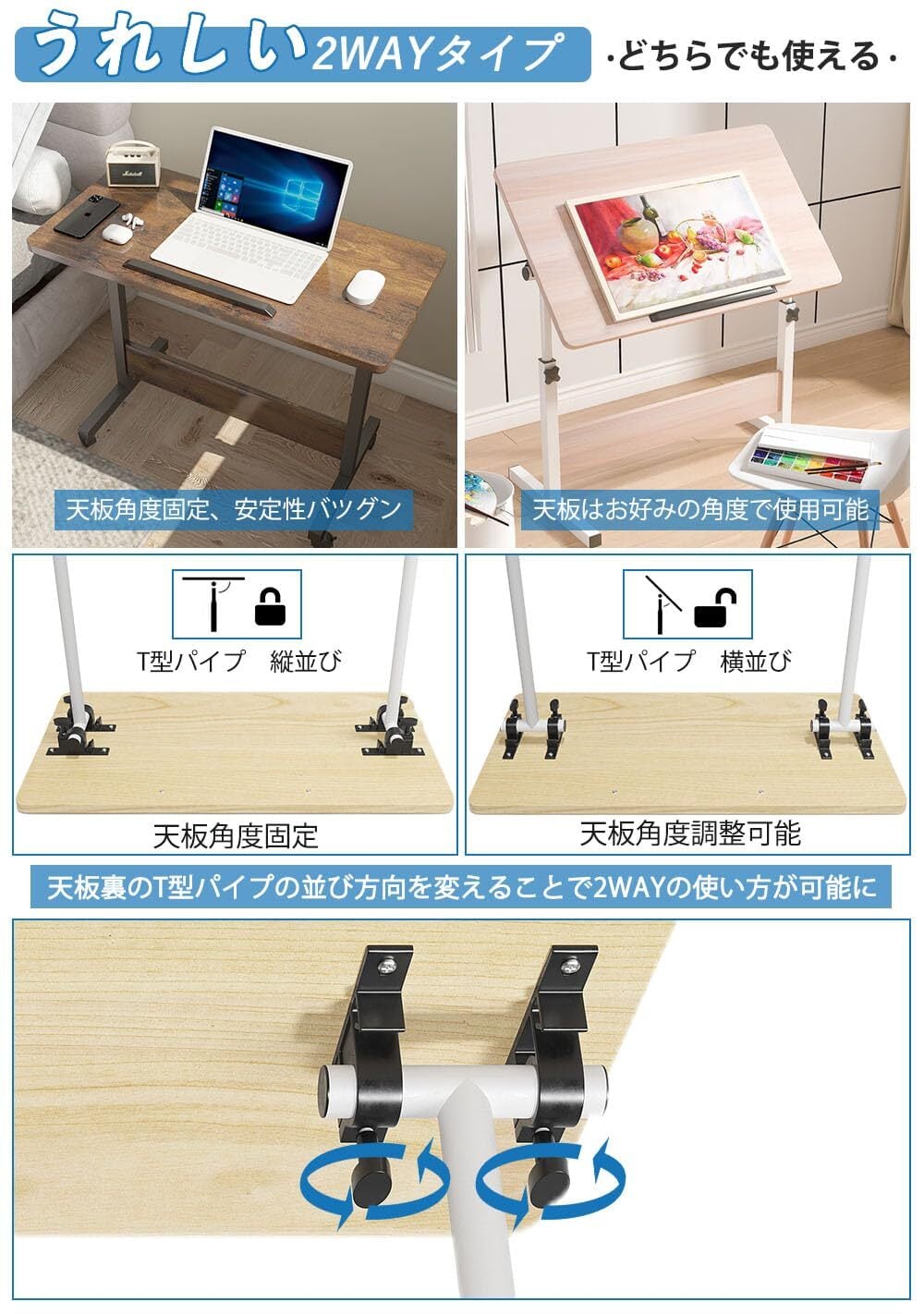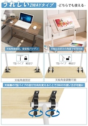 「天板角度調整可能」360°幅広い傾く範囲無段階調整可能、使いやすい角度でお使いいただけます。天板を傾けた時にノートパソコンやタブレット、雑誌などが落ちないようにストッパーが付いています。使用しない時は天板を折り畳みむことで圧迫感がなく収納しておけます。