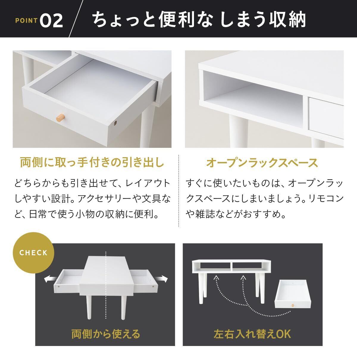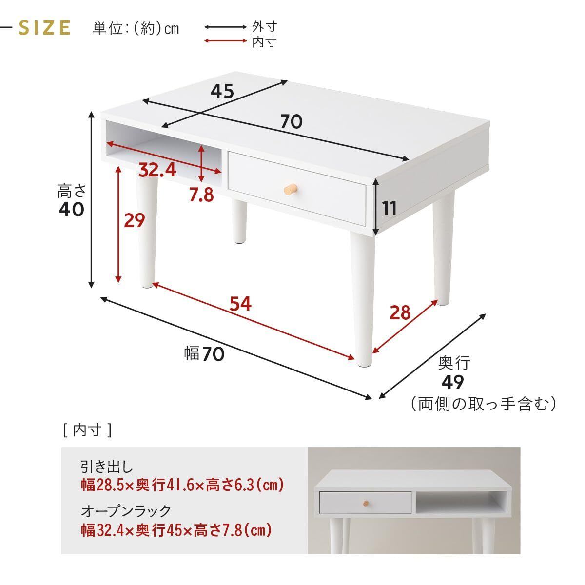 【サイズ】全体:約幅70×奥行49×高さ40cm/引き出し内寸:約幅28.5×奥行41.6×高さ6.3cm/オープンラック内寸:約幅32.4×奥行45×高さ7.8cm 【カラー】ホワイト 【素材】天板:合成樹脂化粧繊維板 ラッカー塗装/脚:天然木(ラバーウッド) 【機能】引き出しは左右入替え可能 【製品重量】約10.5kg 【耐荷重】約20kg 【製造国】中国 【組立所要時間】約10分 ※引き出しの取っ手・脚は、お客様取り付けとなります。プラスドライバーをご用意ください。 ※引き出しの取っ手は、配送事故を防ぐため、内側に取り付けてあります。