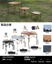 全アルミ材質 防酸化処理されたアルミ合金の素材は長持ちし、錆びにくいし、耐高温性、耐退色性,保管がもっと簡単になります。木製よりもはるかに軽量で、Sサイズは1.5kg、Mサイズは2.1kgLサイズは3.2kgで、同じサイズの木製テーブルの45%の重さです。いつでも雑巾で汚れや水が拭き取れられてきれいになり、お手入れ簡単です。アウトドア用に大活躍です。