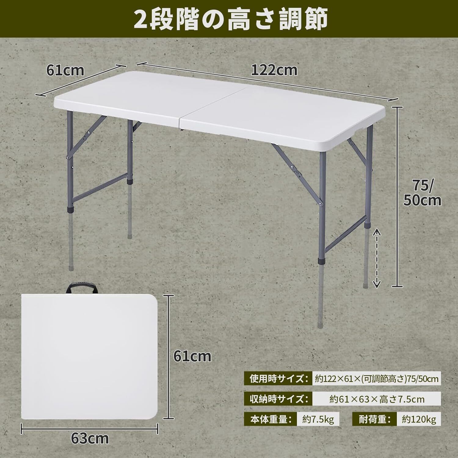 【大人数のパーティーやアウトドアに最適】◆L:180cm展開サイズ:180x 70 x 75H cm、収納サイズ:90x70x7㎝、重量:9.5kg、耐荷重:120kg。180cm幅とワイドな折りたたみ式のガーデンテーブルです。180×70cmの広々した天板なので、大人数での使用に最適です。◆S:122cm展開サイズ:122x 61 x 75/50(可調節高さ)cm、収納サイズ:61x63x7.5㎝、重量:7.5kg、耐荷重:120kg。◆M:152cm展開サイズ:152x 74 x75H cm、収納サイズ:74x78x8㎝、重量:9.6kg、耐荷重:120kg。